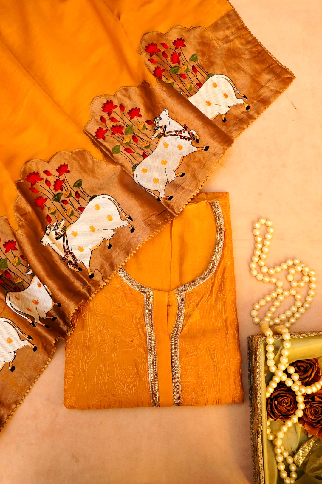 - Yellow Pure Chanderi Silk Suit Set with Antique Embroidery