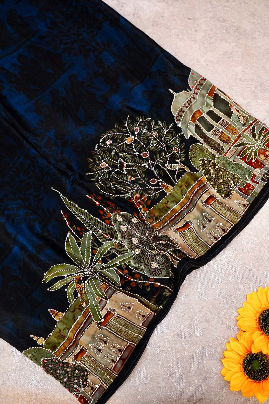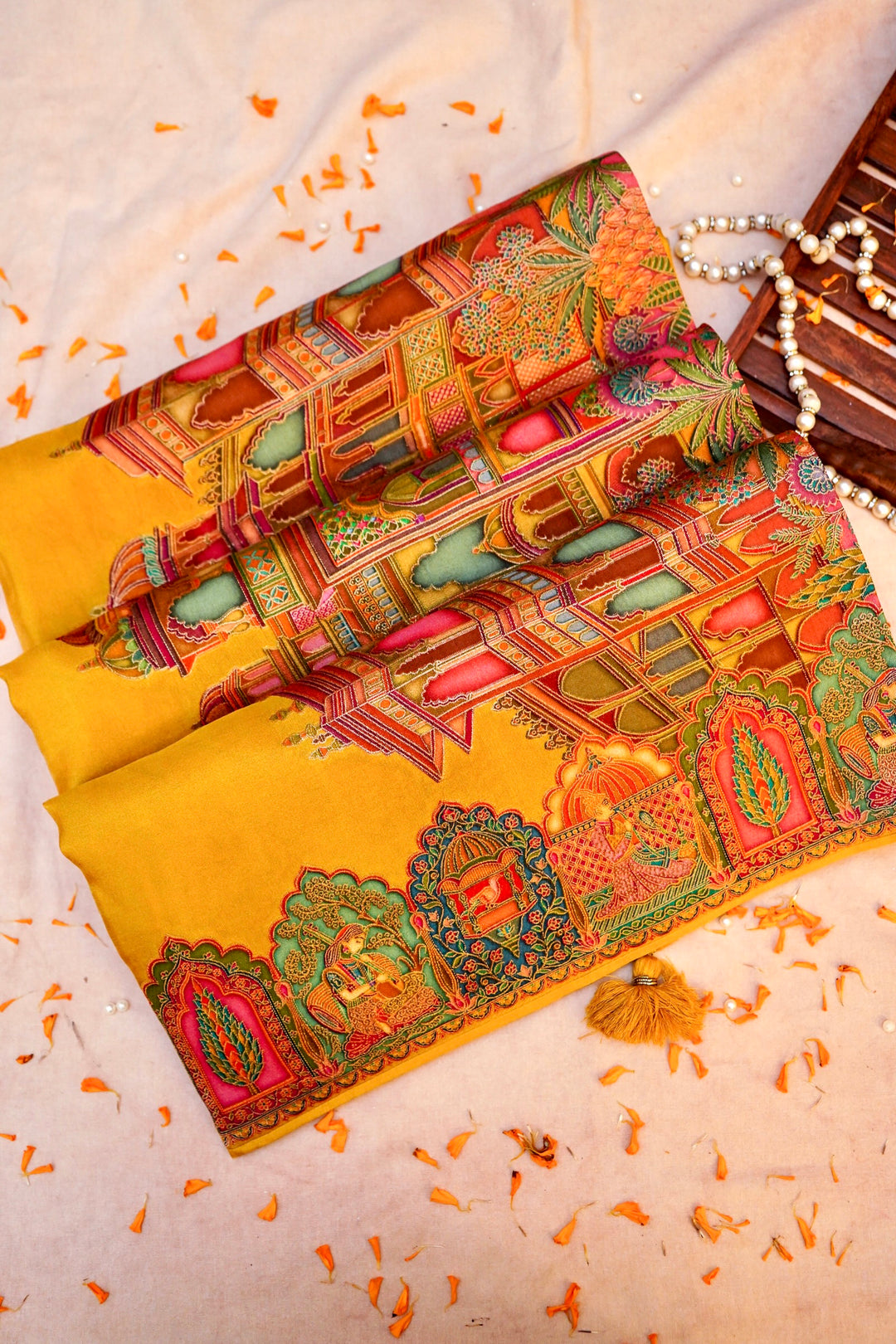 - Red Crepe Silk Saree with Multicolor Print, Zari Border & Pallu