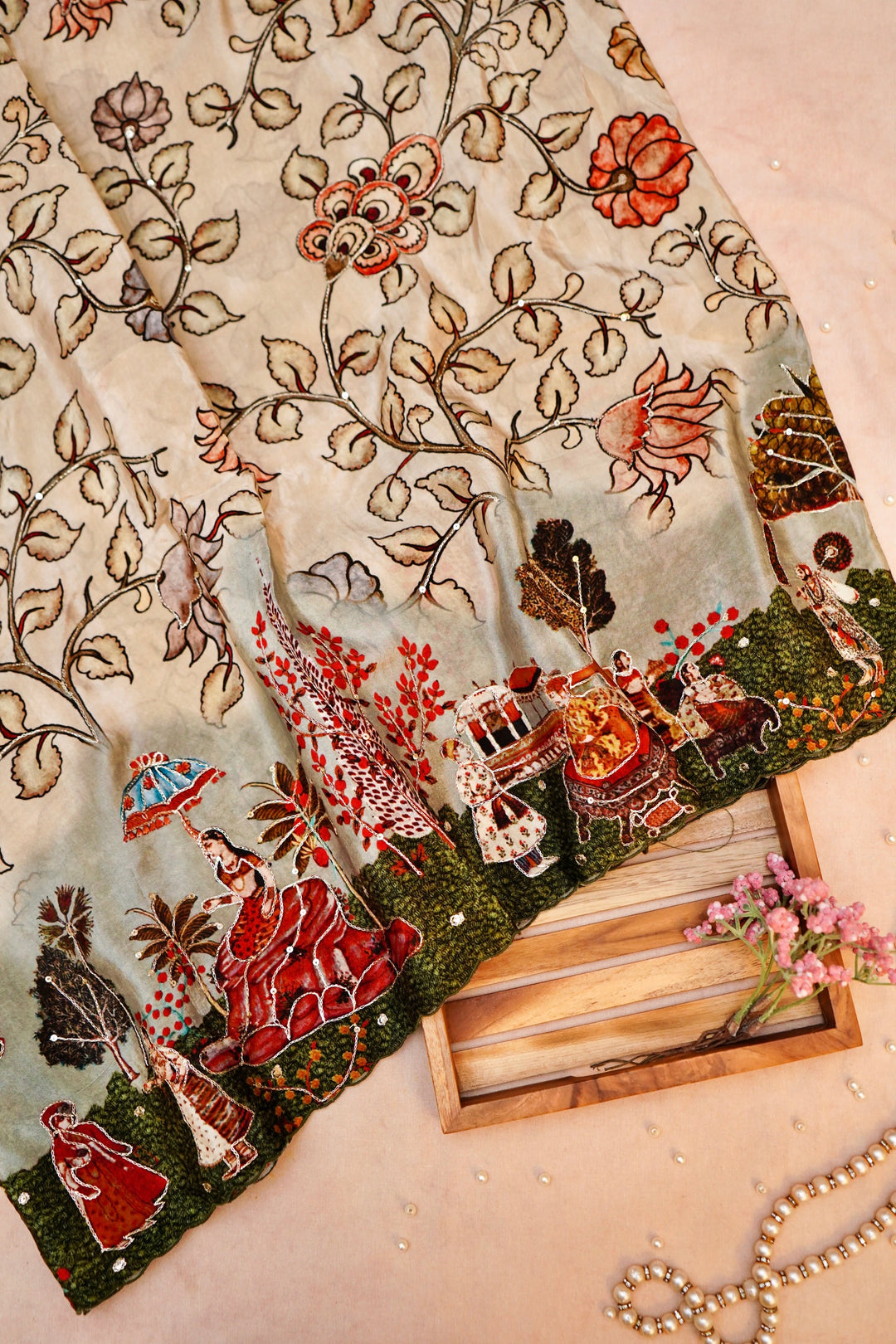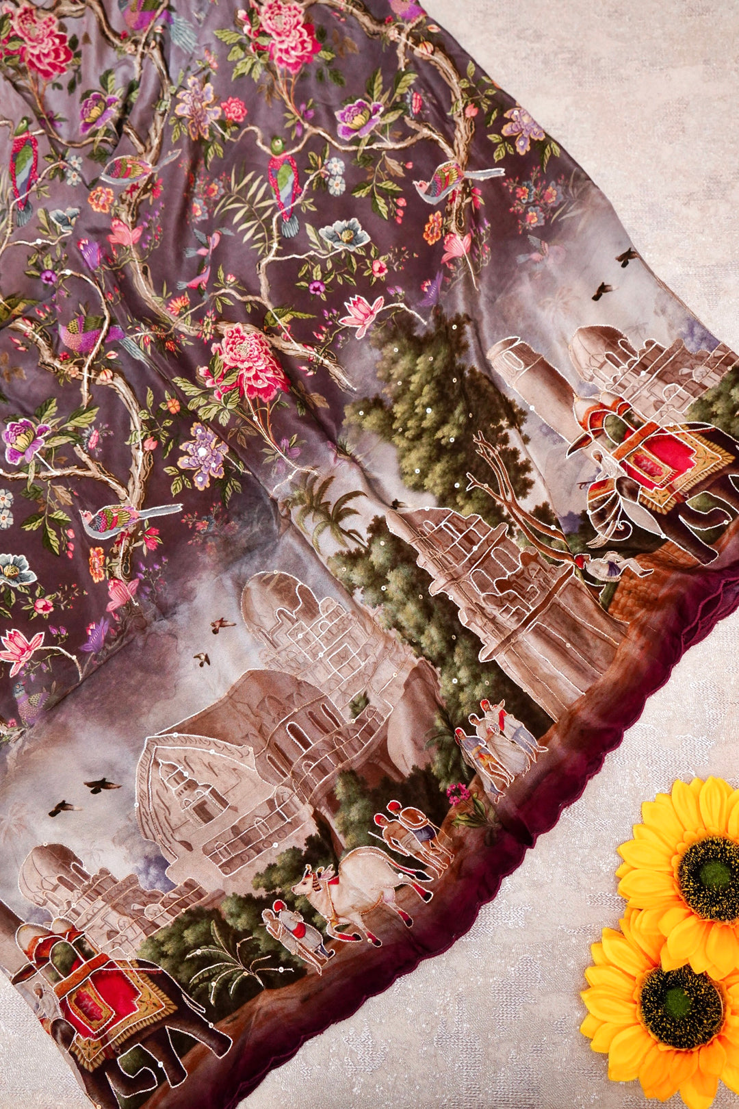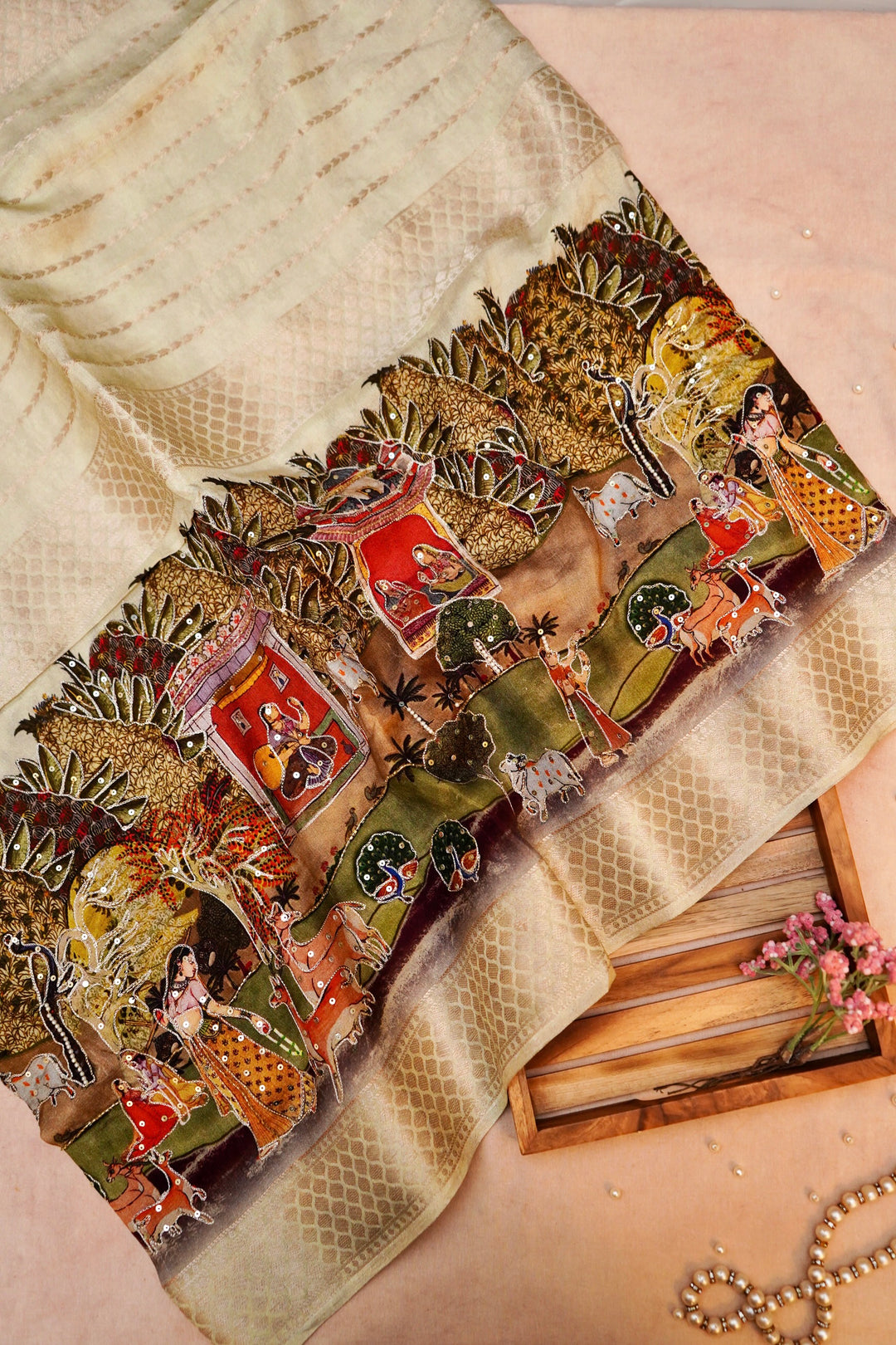 - Whispers of Nature Beige Crepe Silk Saree with Bird and Figure Motifs