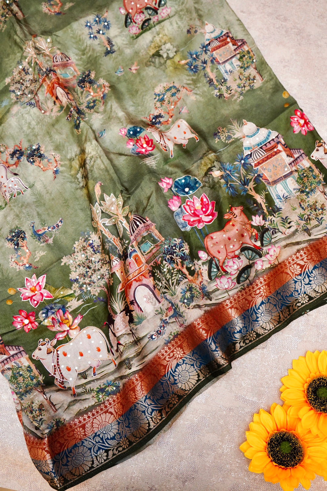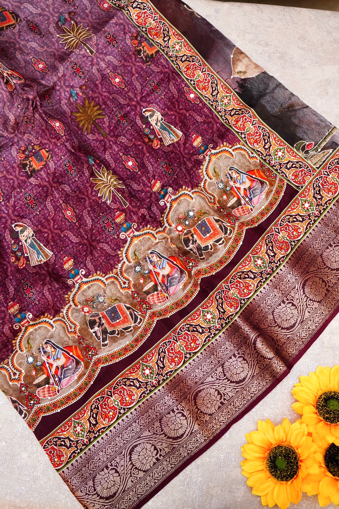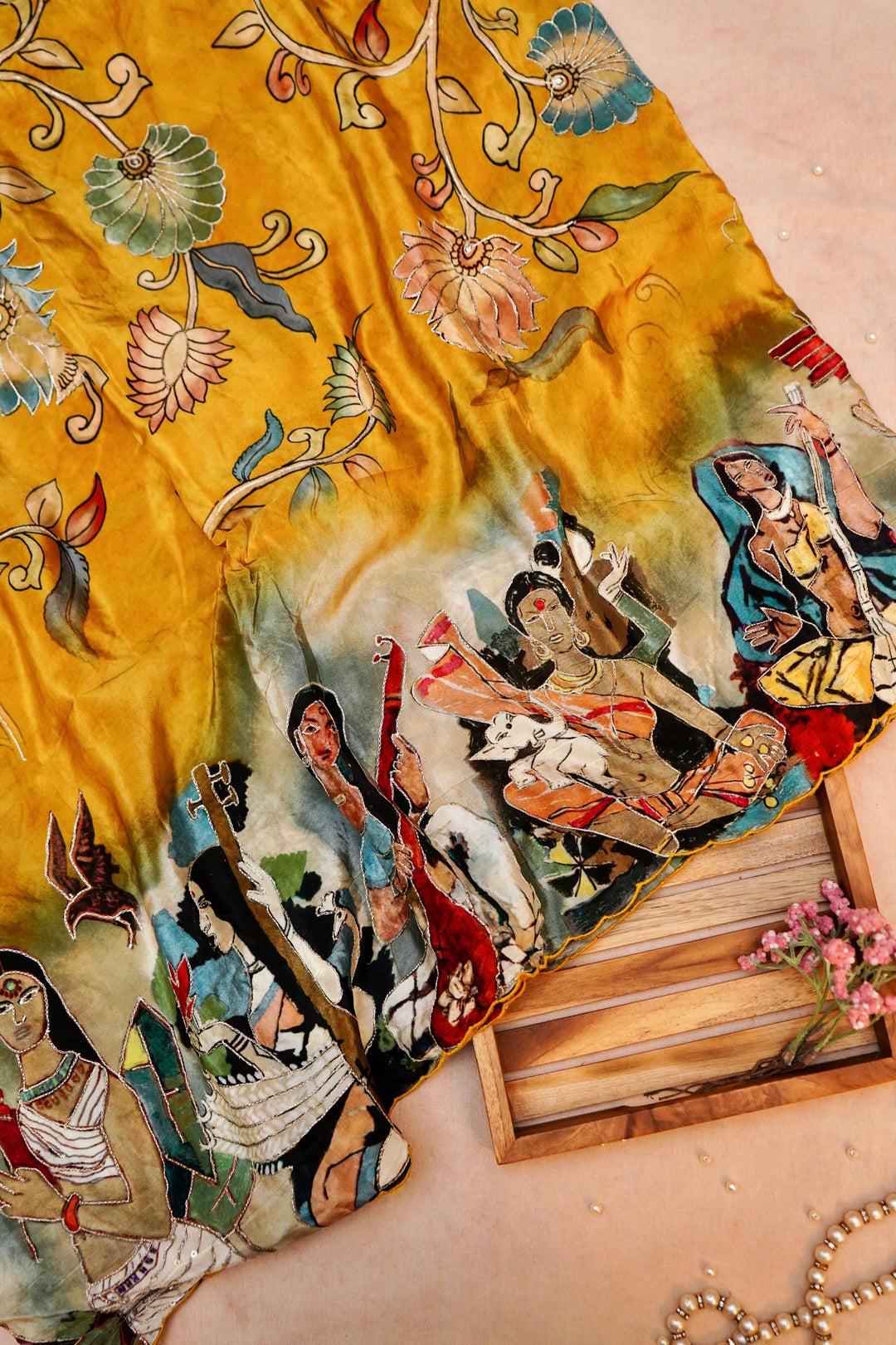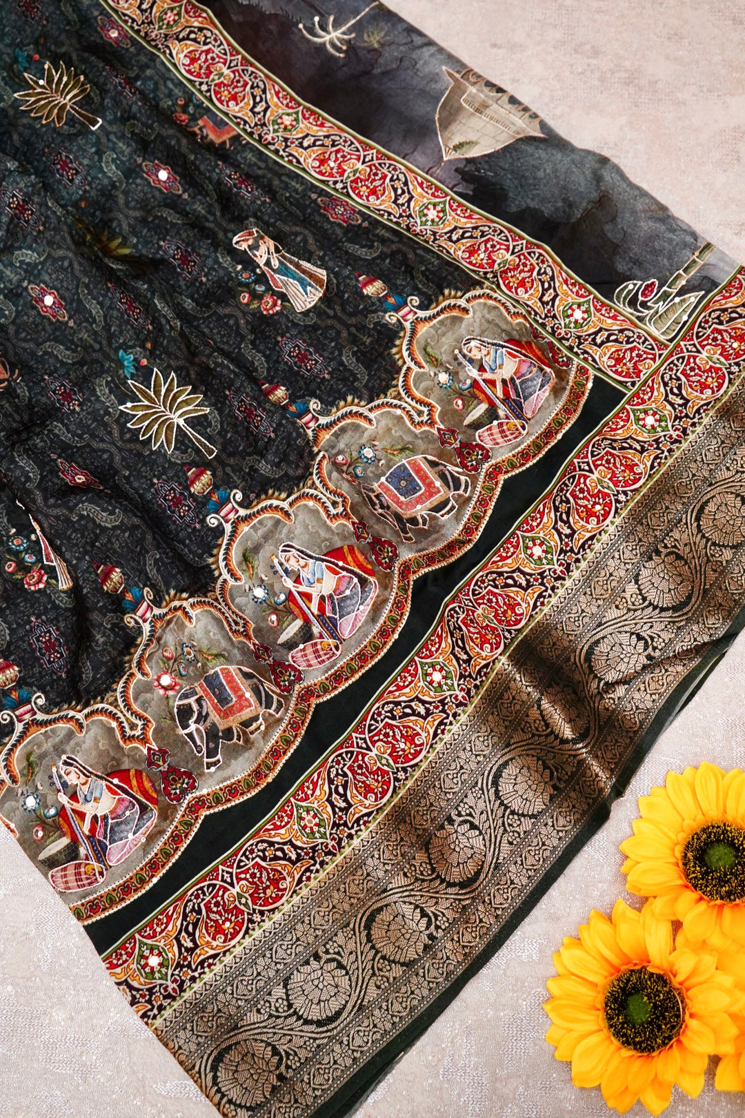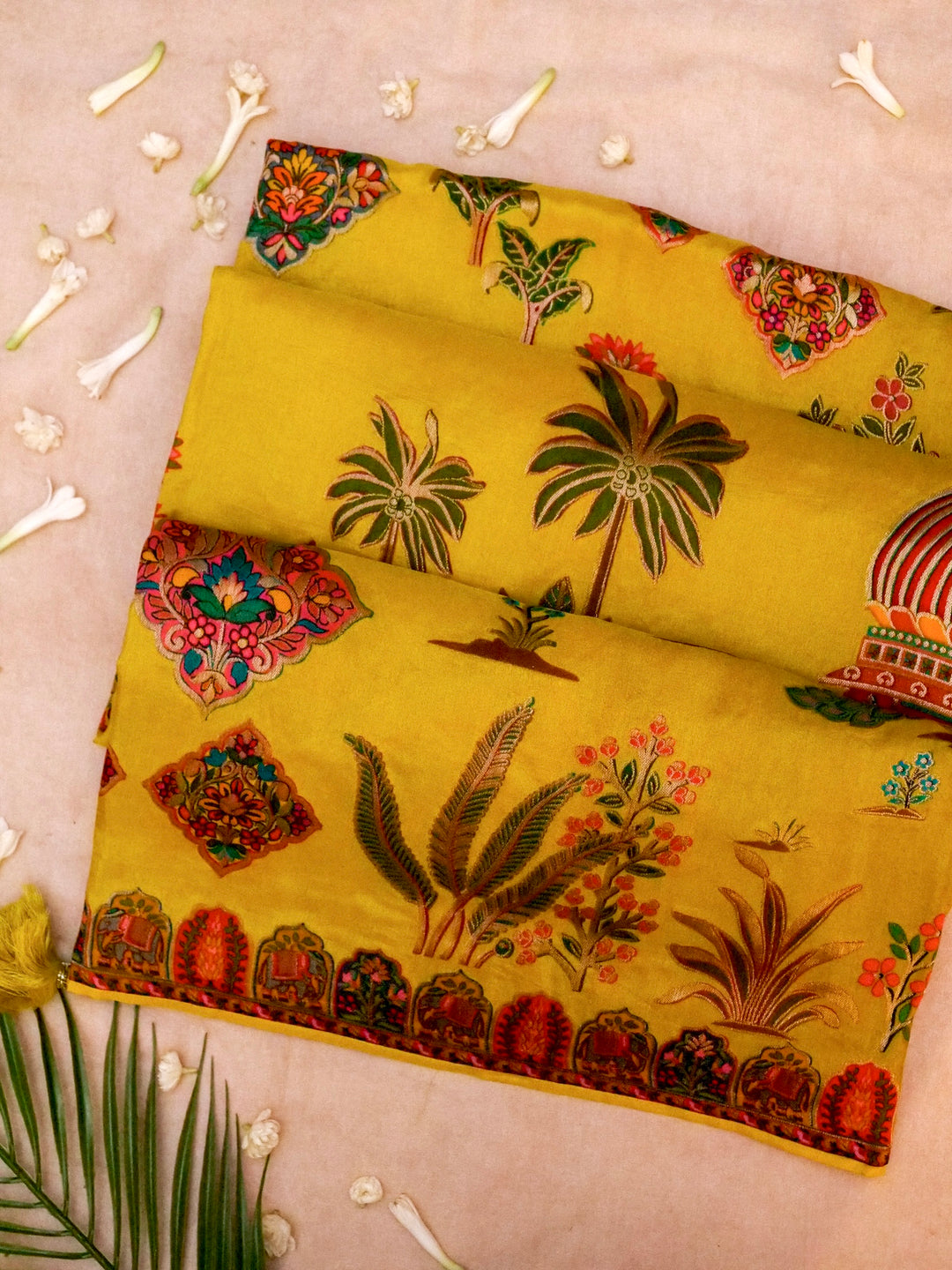 - Sunshine in Bloom Vibrant Yellow Crepe Silk Saree with Whimsical Bird and Figure Motifs