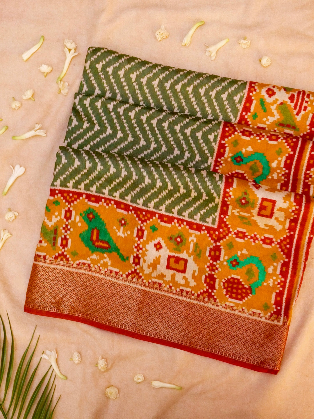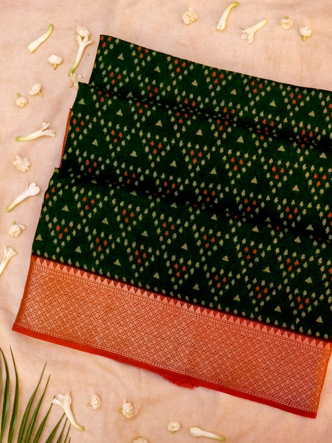 - Green Crepe Silk Saree with Geometric Print and Zari Border