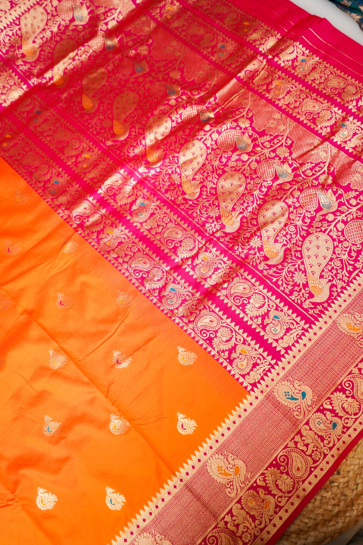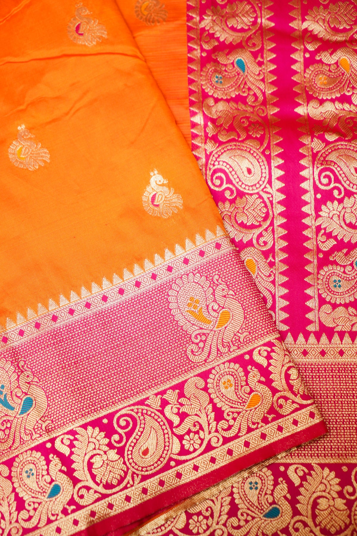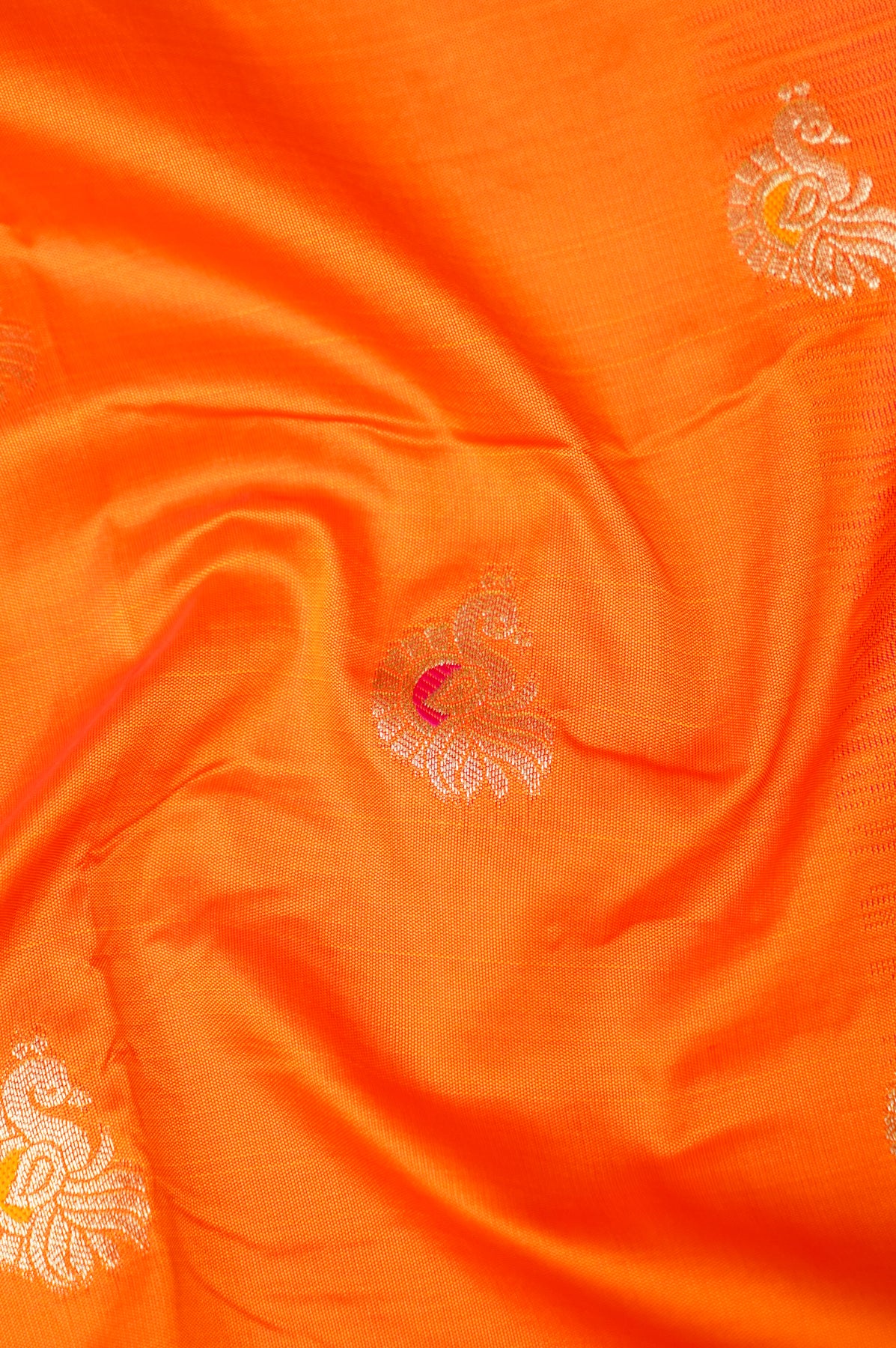 Orange Soft Silk Kanjivaram Inspired Bird Motifs Saree with Contrast Border Pallu