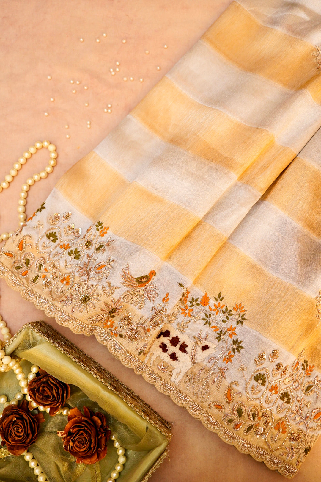 - Golden Maharani Tissue Silk Saree with Pitta Zari Elephant Motifs & Scallop Border