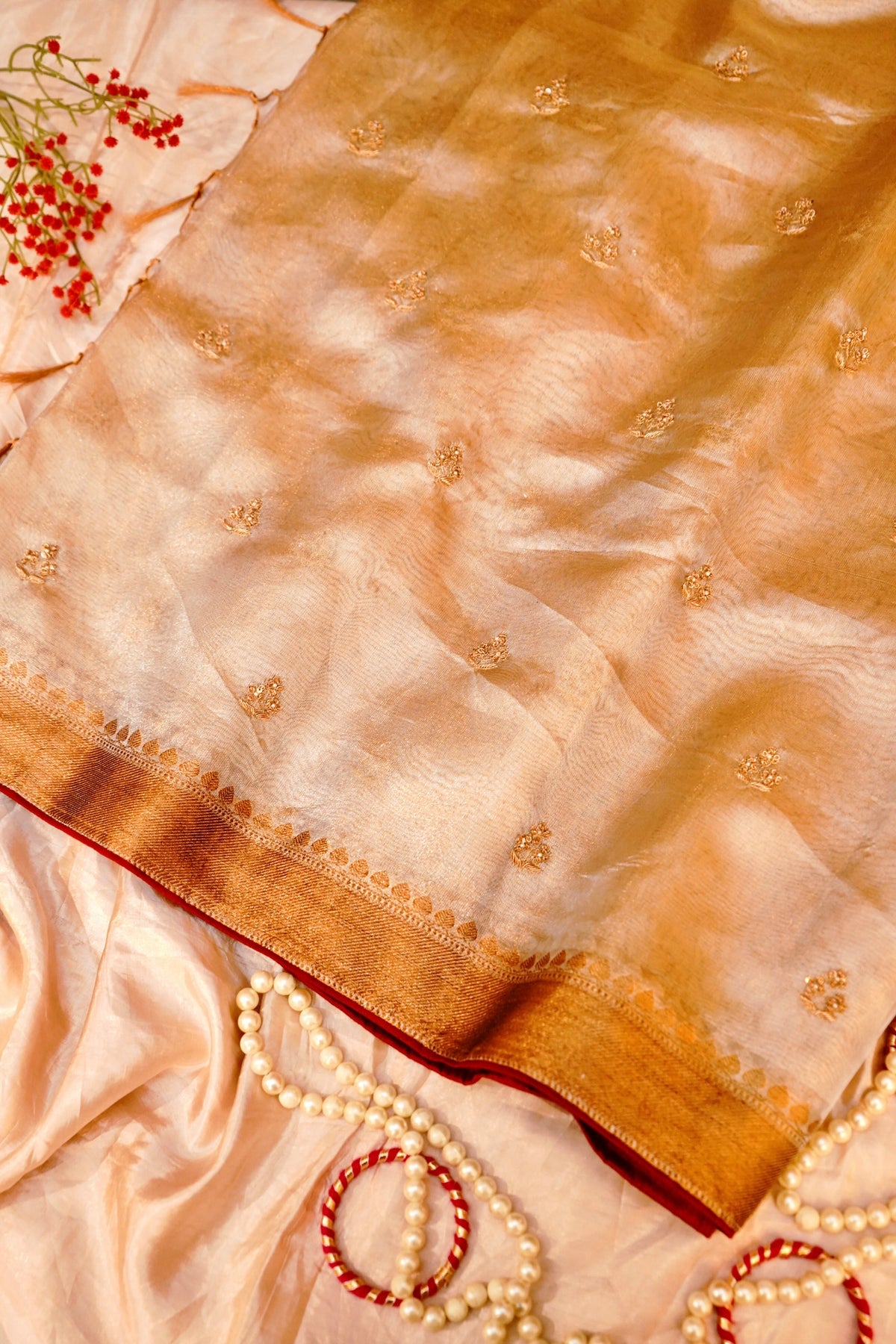 Luxurious Rose Gold Pure Silk Tissue Saree with Zardozi Embroidery