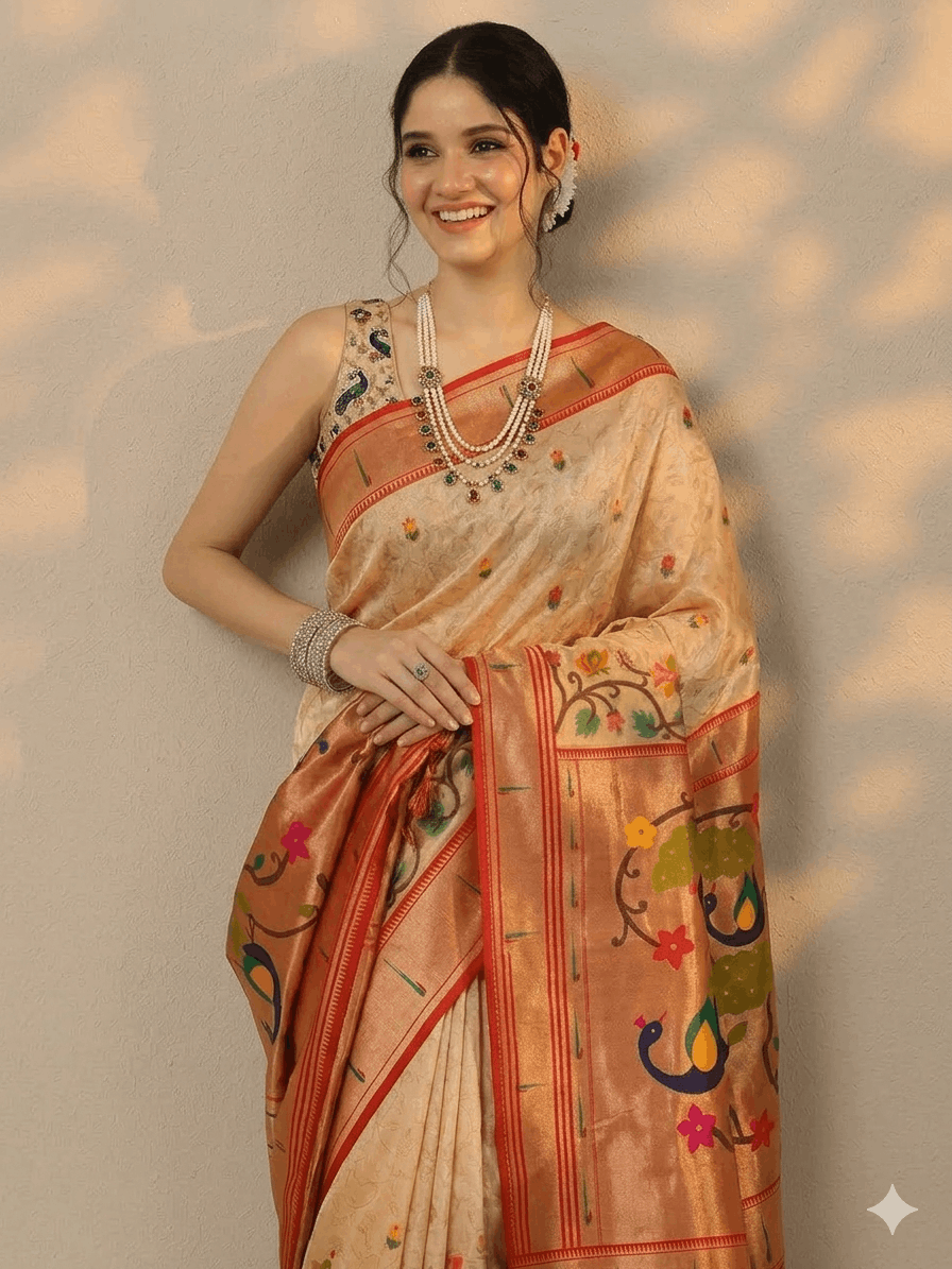 - Beige Banarasi Tissue Silk Meenakari Saree with Paithani Border Pallu