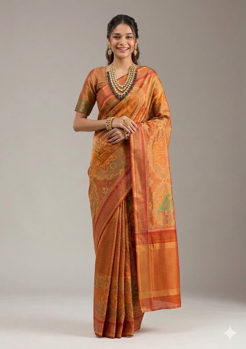 - For reception & evening events: A gold tissue saree or a lighter golden silk saree offers shine without the weight. It moves easily through photographs and dancing.