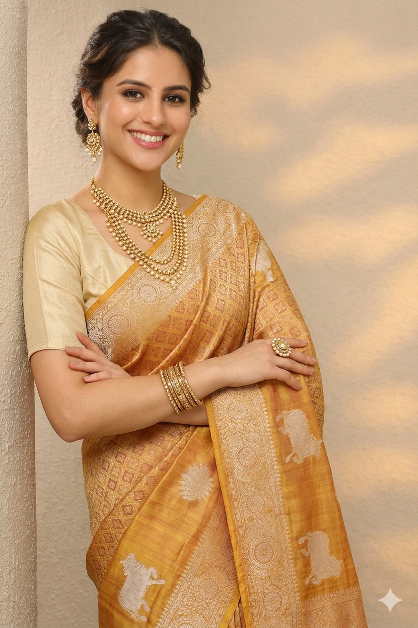 - Golden Maharani Tissue Silk Saree with Pitta Zari Elephant Motifs & Scallop Border