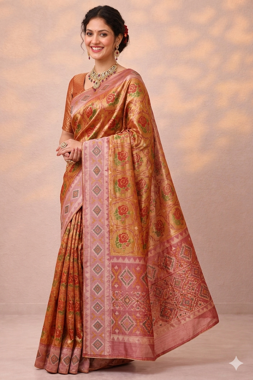 - Gold tissue saree: Thin, semi-sheer and woven with metallic threads for a sparkling, airy fall. A gold tissue saree suits evening receptions and photo-ready moments. (See our tissue options in the tissue silk collection.)