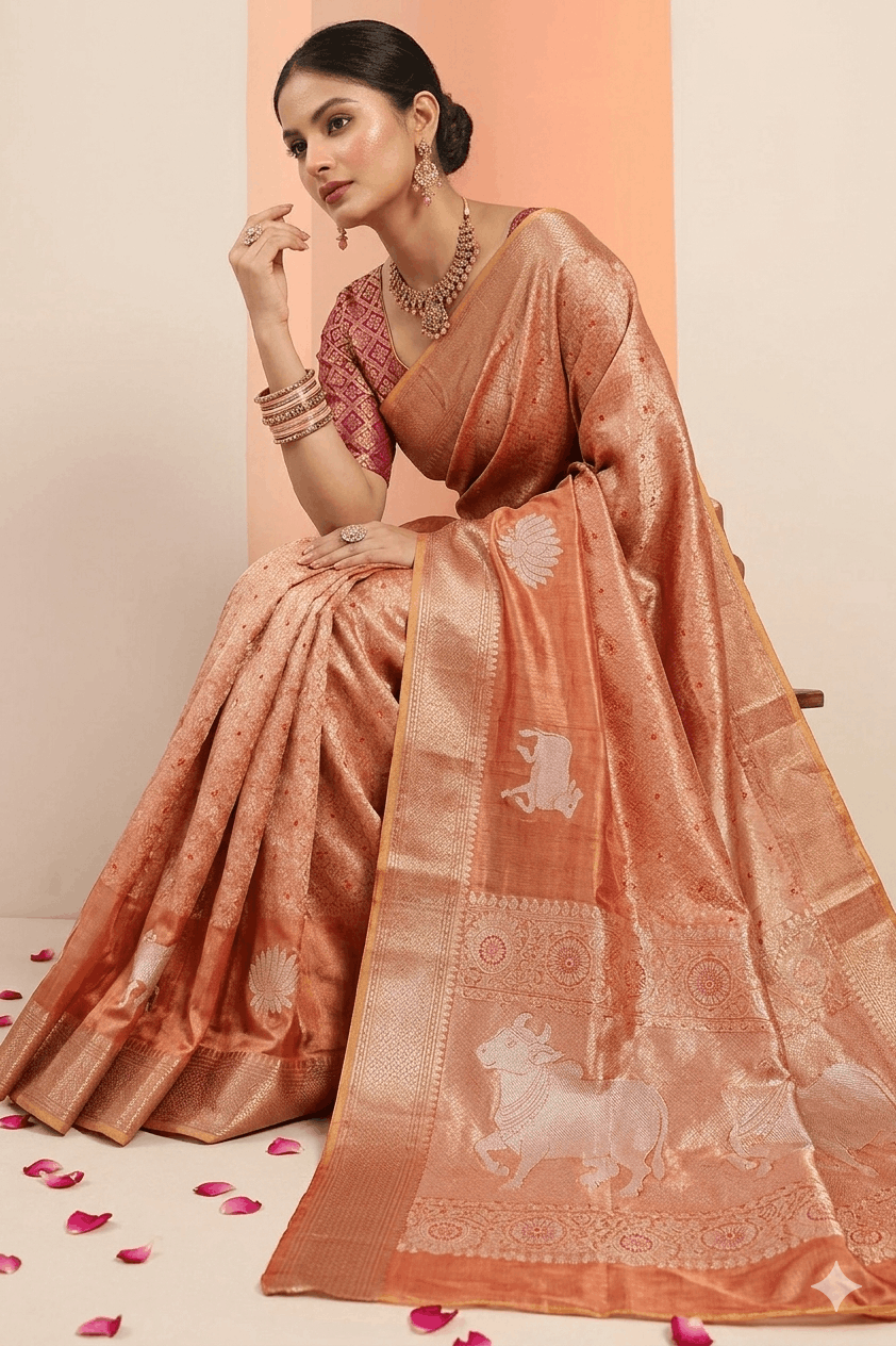 - Copper Brown Banarasi Maharani Tissue Silk Saree with Gayatri Mantra Pallu & Scallop Border