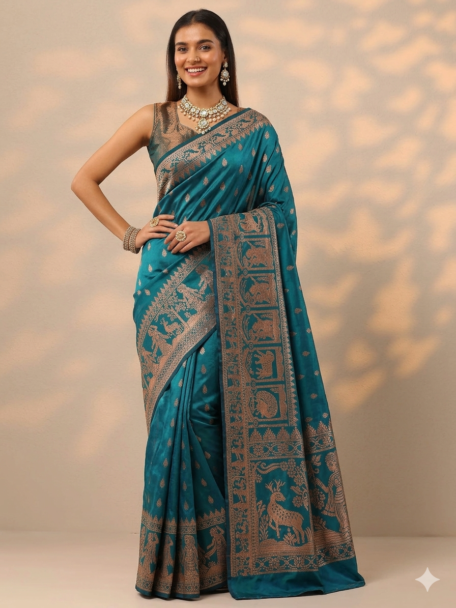 - Katan Silk Green Banarasi Saree: Rich and smooth, with bold zari motifs.