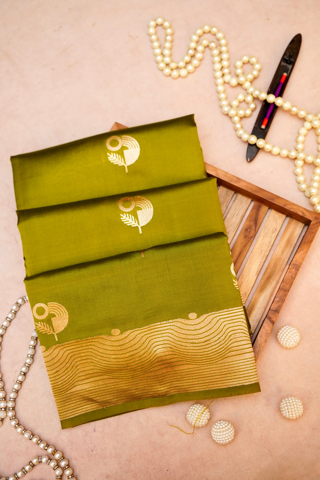 - Dark Green Handwoven Banarasi Katan Silk Saree with Golden Zari Nandi Motifs