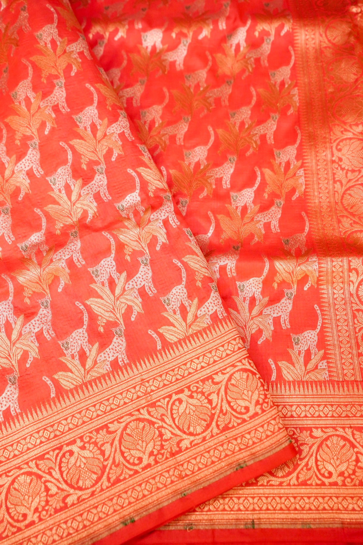 This Handwoven Banarasi Shikargah Katan Silk Saree features intricate all-over Sona Rupa zari Shikargah motifs, showcasing rich heritage artistry. The luxurious katan silk body offers a soft, lustrous drape, while the detailed weaving adds a royal, statement look. Perfect for weddings and grand celebrations, this saree beautifully blends tradition, elegance, and timeless Banarasi craftsmanship