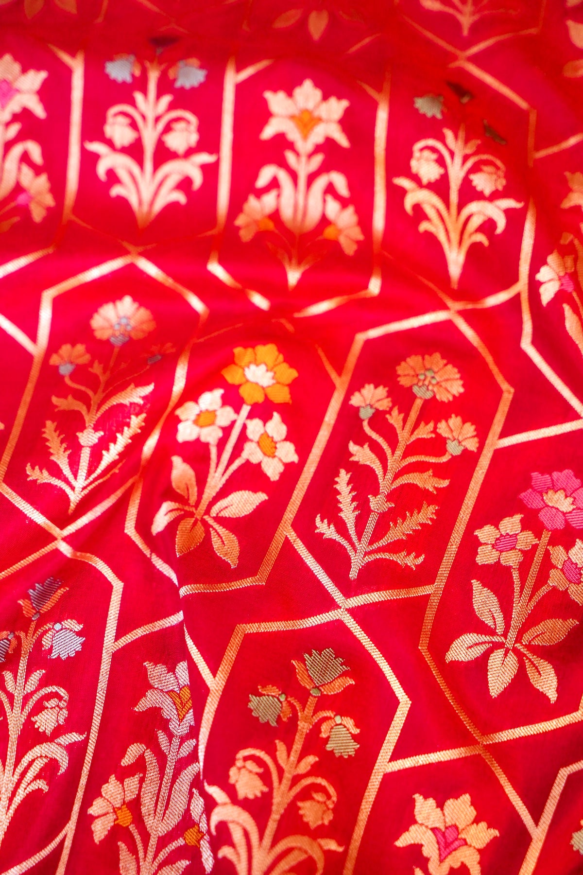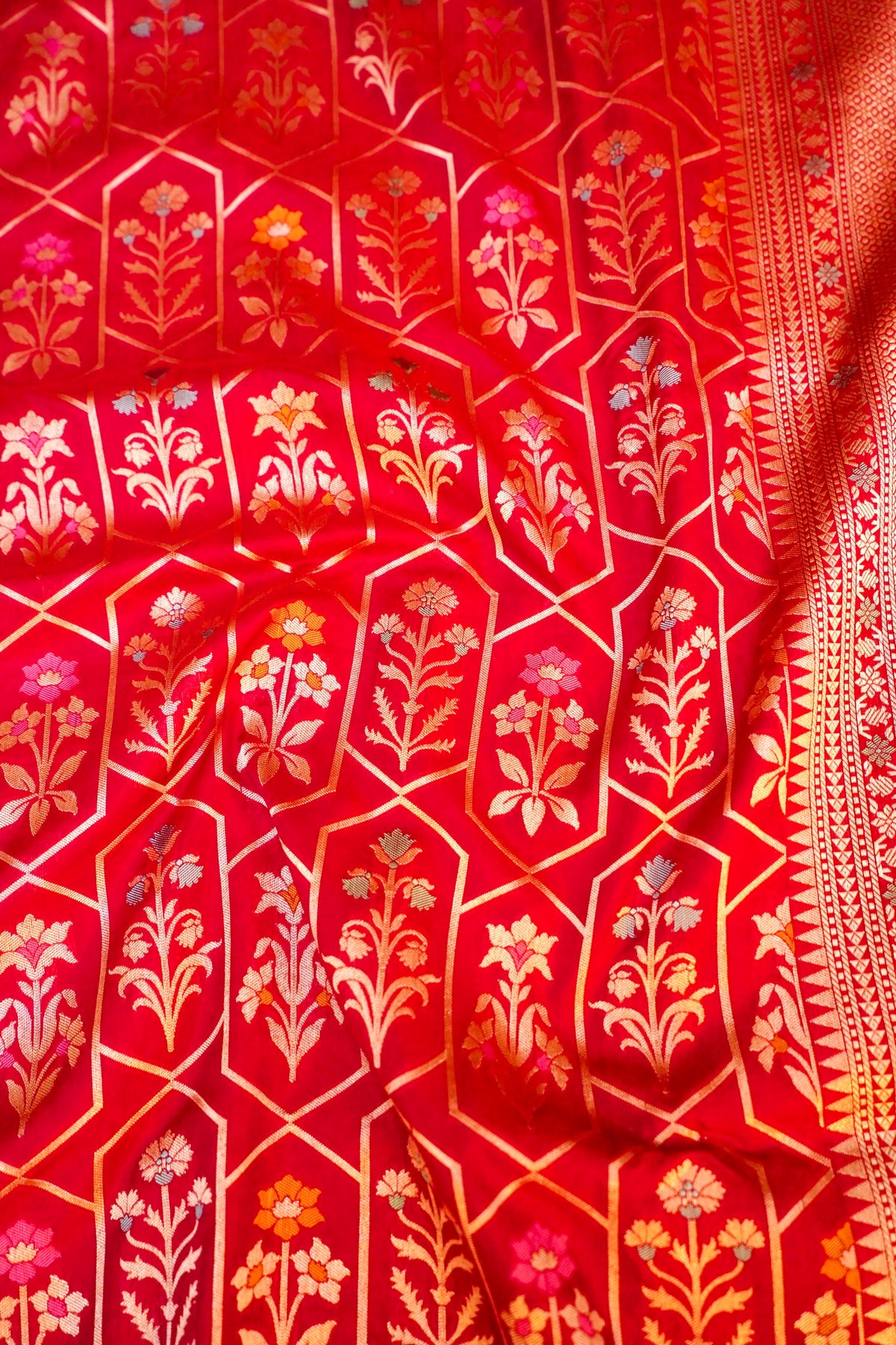 Radiate timeless charm with this Pink Pure Handloom Katan Silk Meenakari Saree, a stunning creation from the looms of Banaras. Crafted with fine silk threads and adorned with intricate Meenakari zari weaving, this saree beautifully blends traditional craftsmanship with graceful elegance. Its lustrous pink hue and detailed motifs make it an ideal drape for weddings, festivities, and special occasions