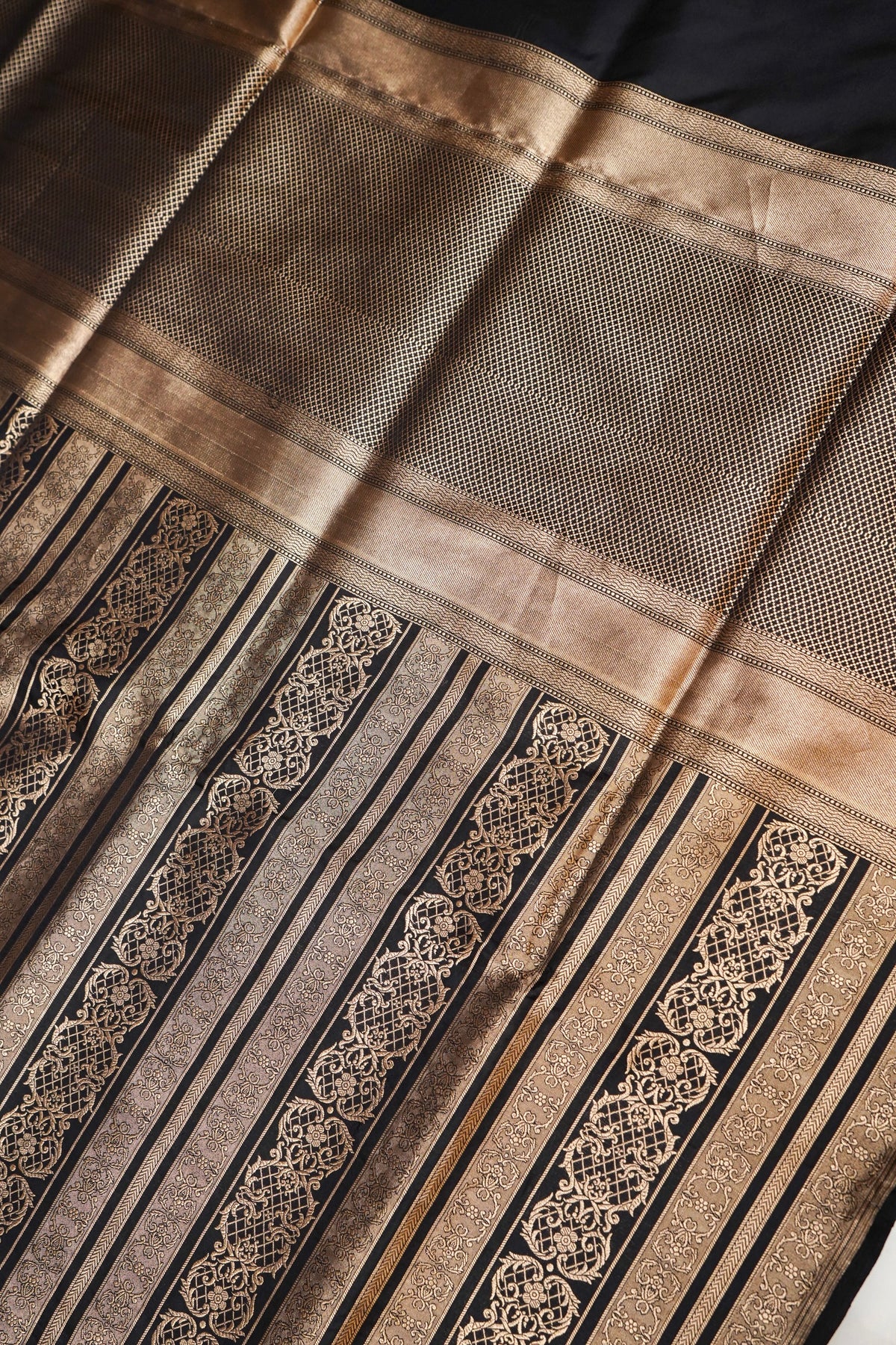Handwoven Black Banarasi Pure Katan Silk Contemporary Saree with Zari Stripe Design
