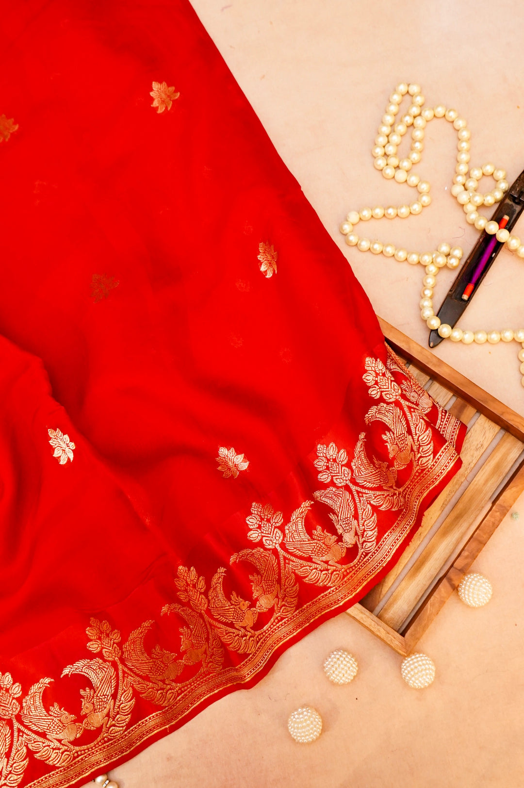 Pair with Kundan or Polki jewellery, a contrasting blouse (emerald green or royal blue), and a sleek clutch. One customer shared that her red mashru saree and gold temple jewellery became the centrepiece of her bridal shoot—pure magic in crimson and gold.