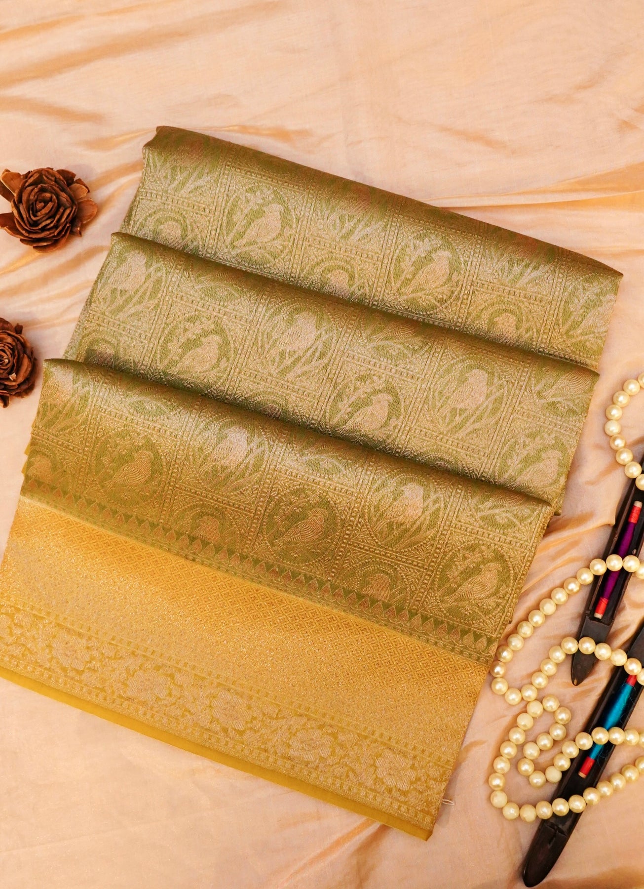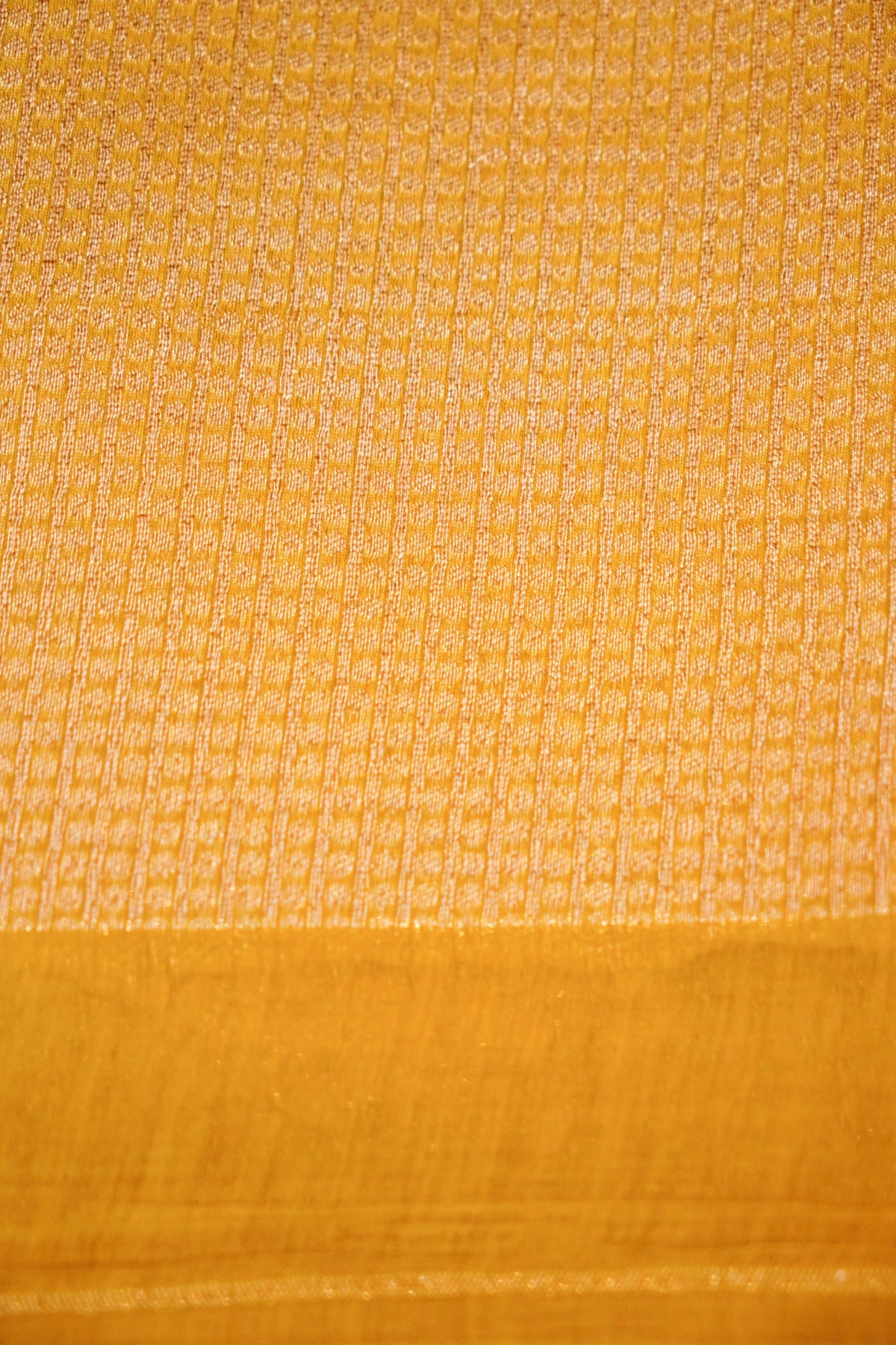 This Banarasi handloom Pure Chanderi Silk Brocade Saree comes in a rich olive green shade woven with antique zari for a subtle, elegant sheen. The bright yellow contrast border and pallu add a vibrant traditional highlight, creating a beautiful balance of depth and brightness. Lightweight, graceful, and timeless, this saree is perfect for festive occasions, cultural events, and elegant daytime celebrations
