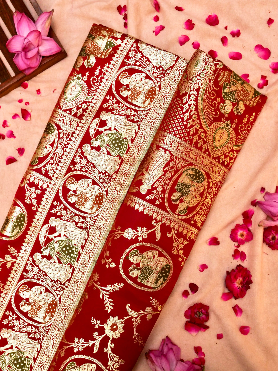 - Scarlet Red Banarasi Pure Satin Silk Saree with Heavy Zari Work