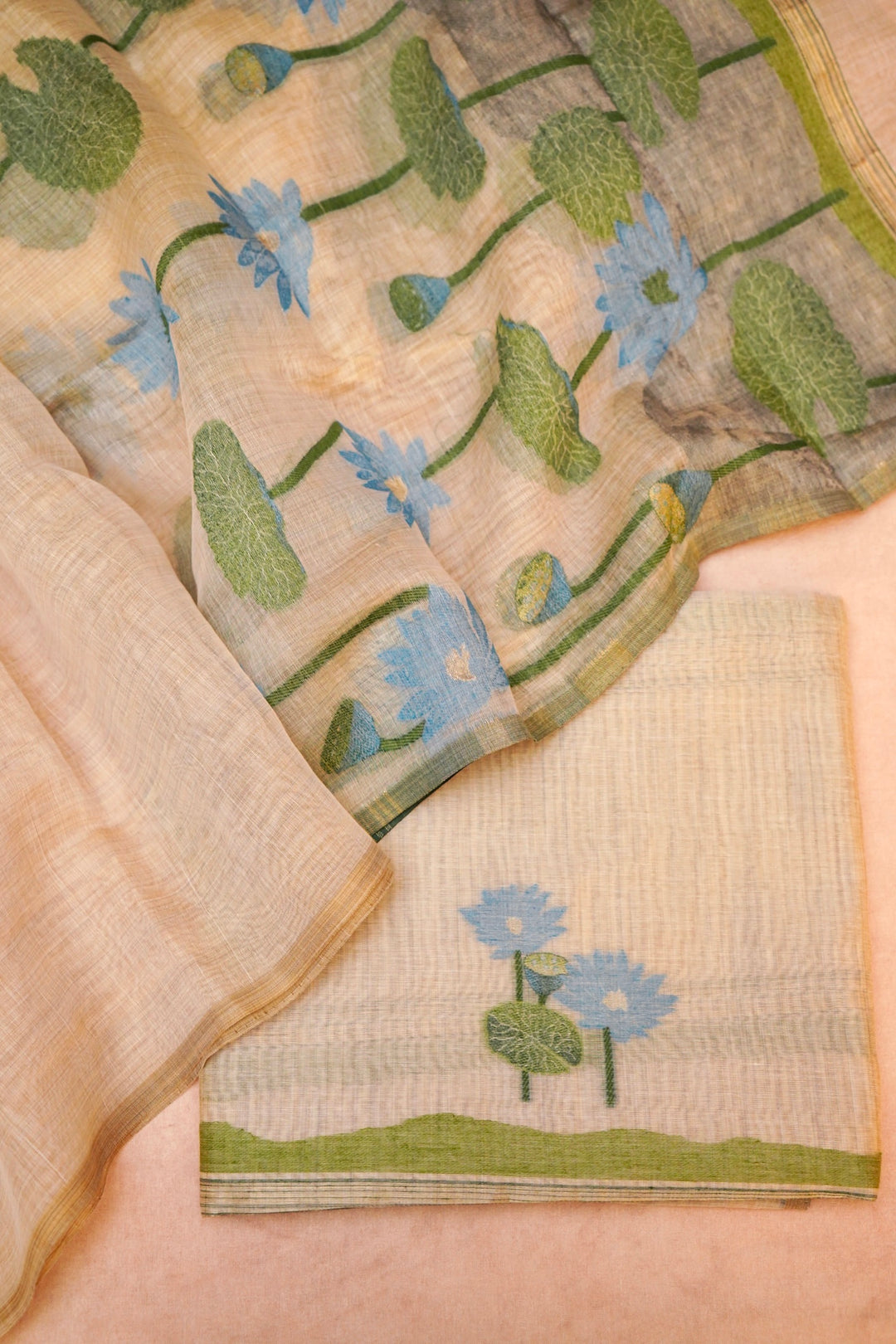 - Beige Gold Cotton Silk Suit Set with Green Purple Floral Embroidery