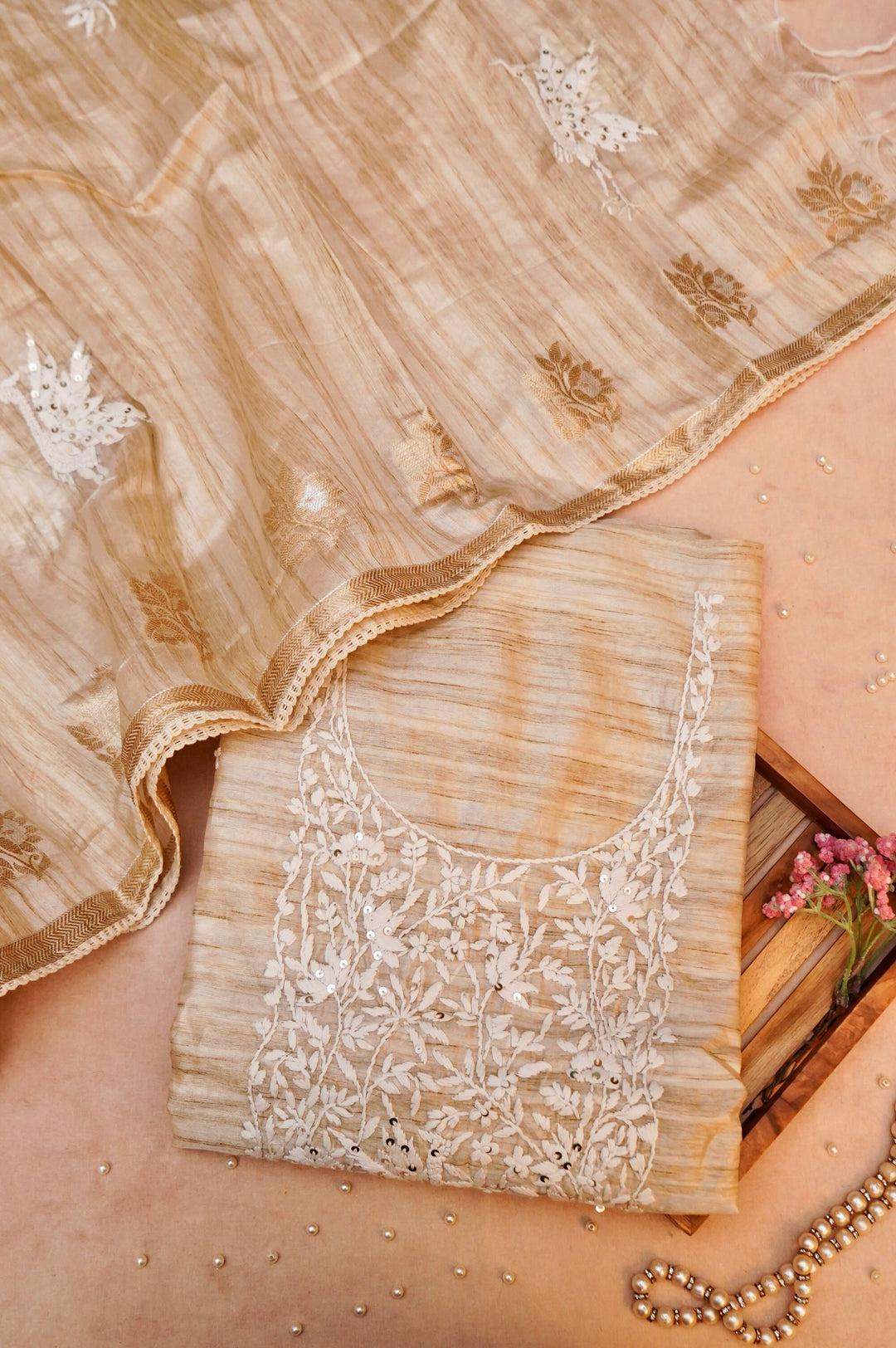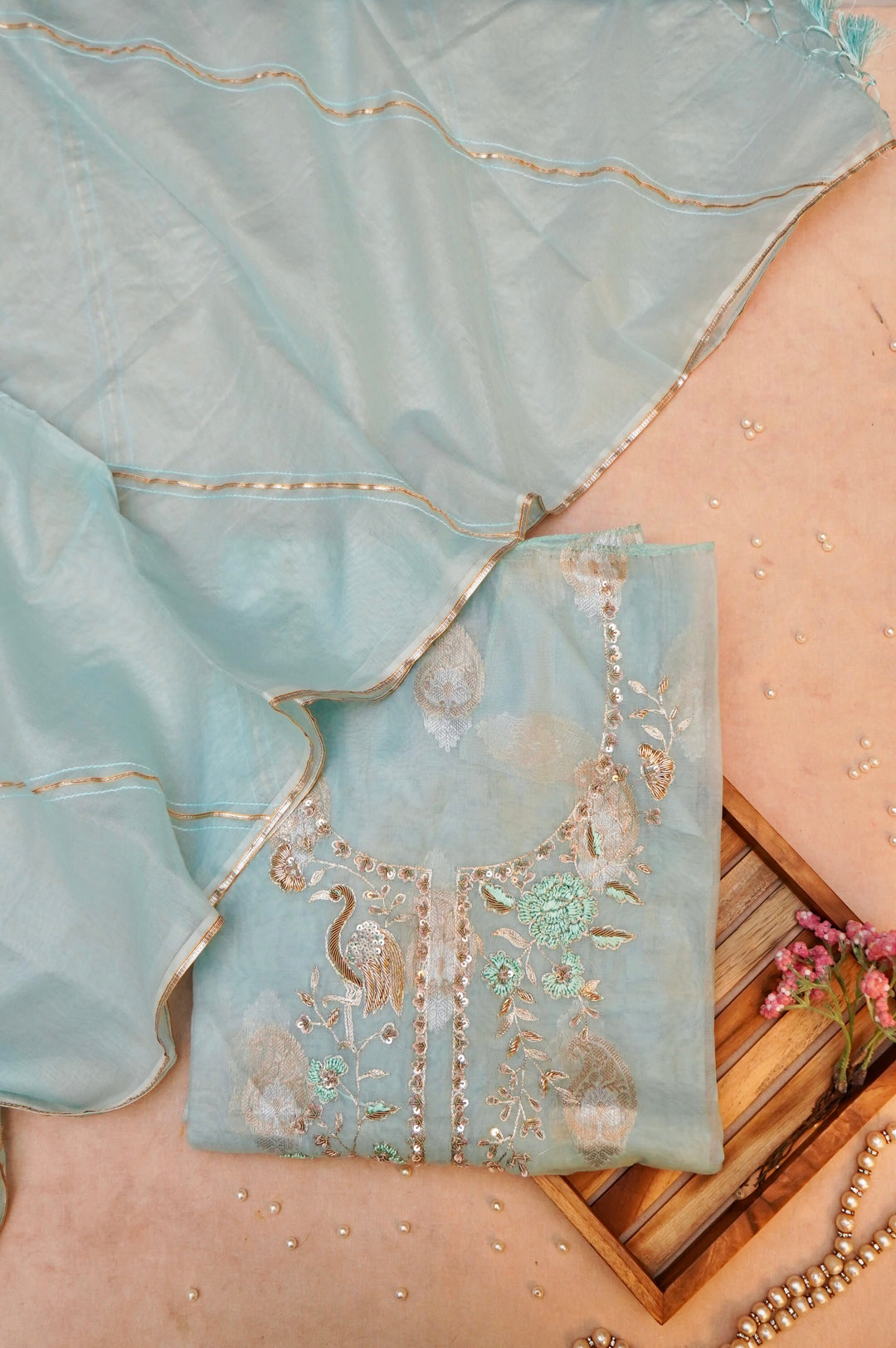 - Unstitched Powder Blue Pure Chanderi Tissue Suit Set