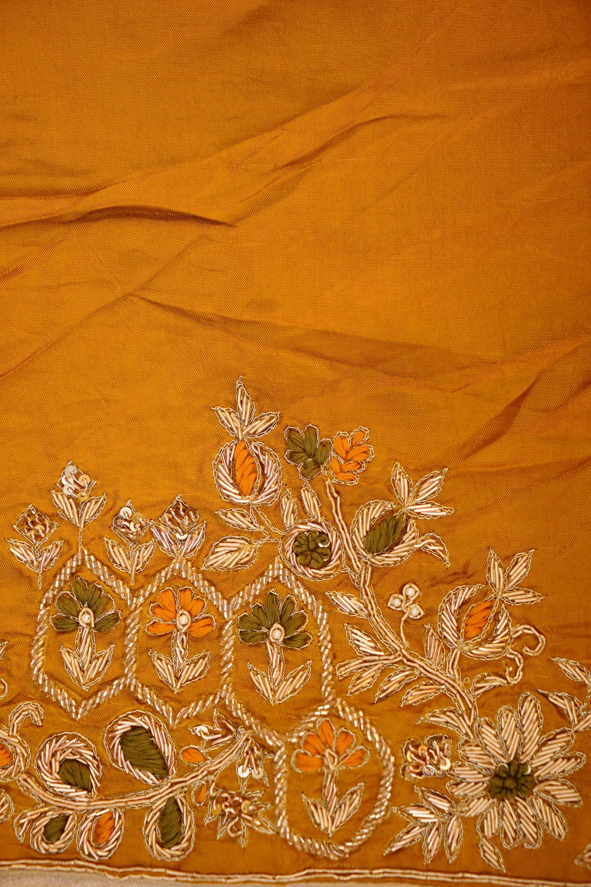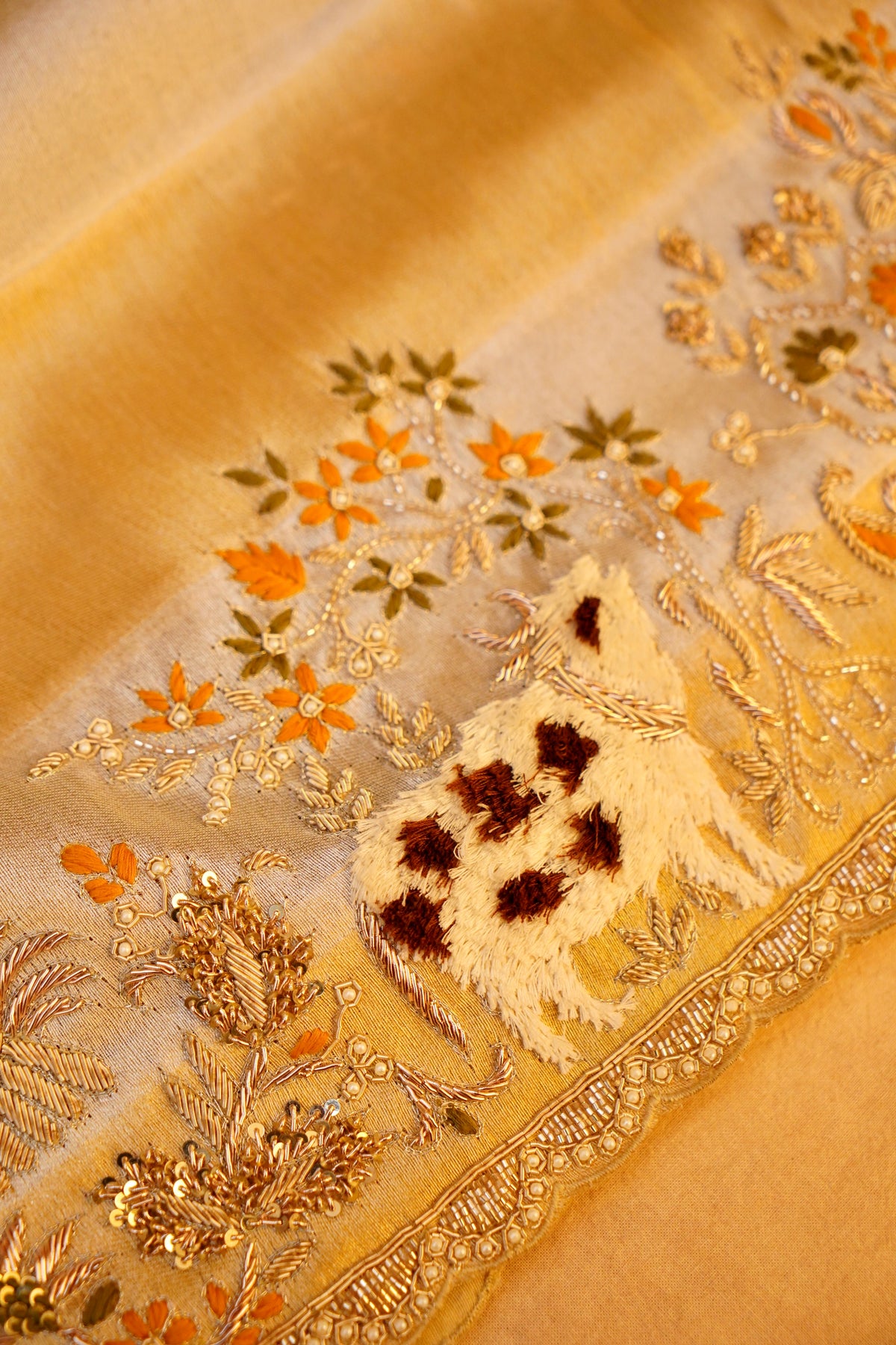 A masterpiece of opulence and artistry, this Designer Golden and Silver Tissue Silk Saree radiates regal splendour. The saree features exquisite hand Zardozi embroidery with enchanting bird motifs, intricately crafted to evoke timeless elegance. Its shimmering base is beautifully framed with a Meenakari border and pallu, adding vibrant detail and royal finesse. Perfect for grand celebrations, this saree is a true testament to the heritage of Banarasi craftsmanship and modern sophistication