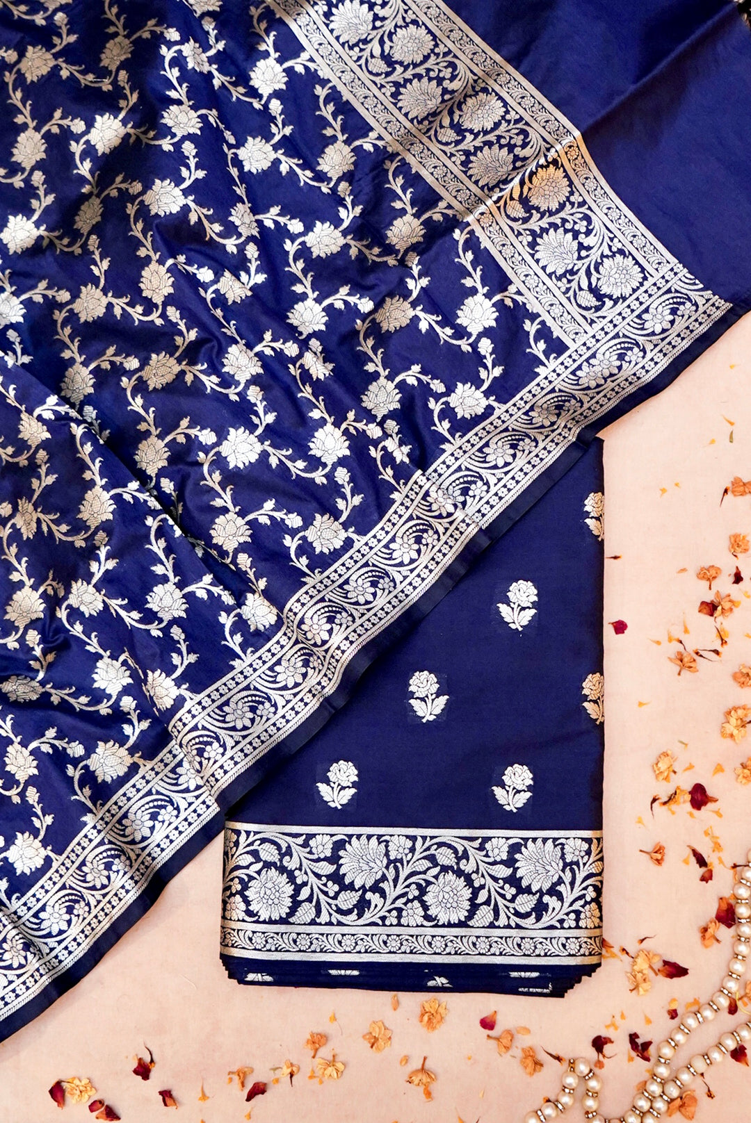 - Navy Blue Traditional Banarasi Silk Bootidar Suit with Jaal Dupatta