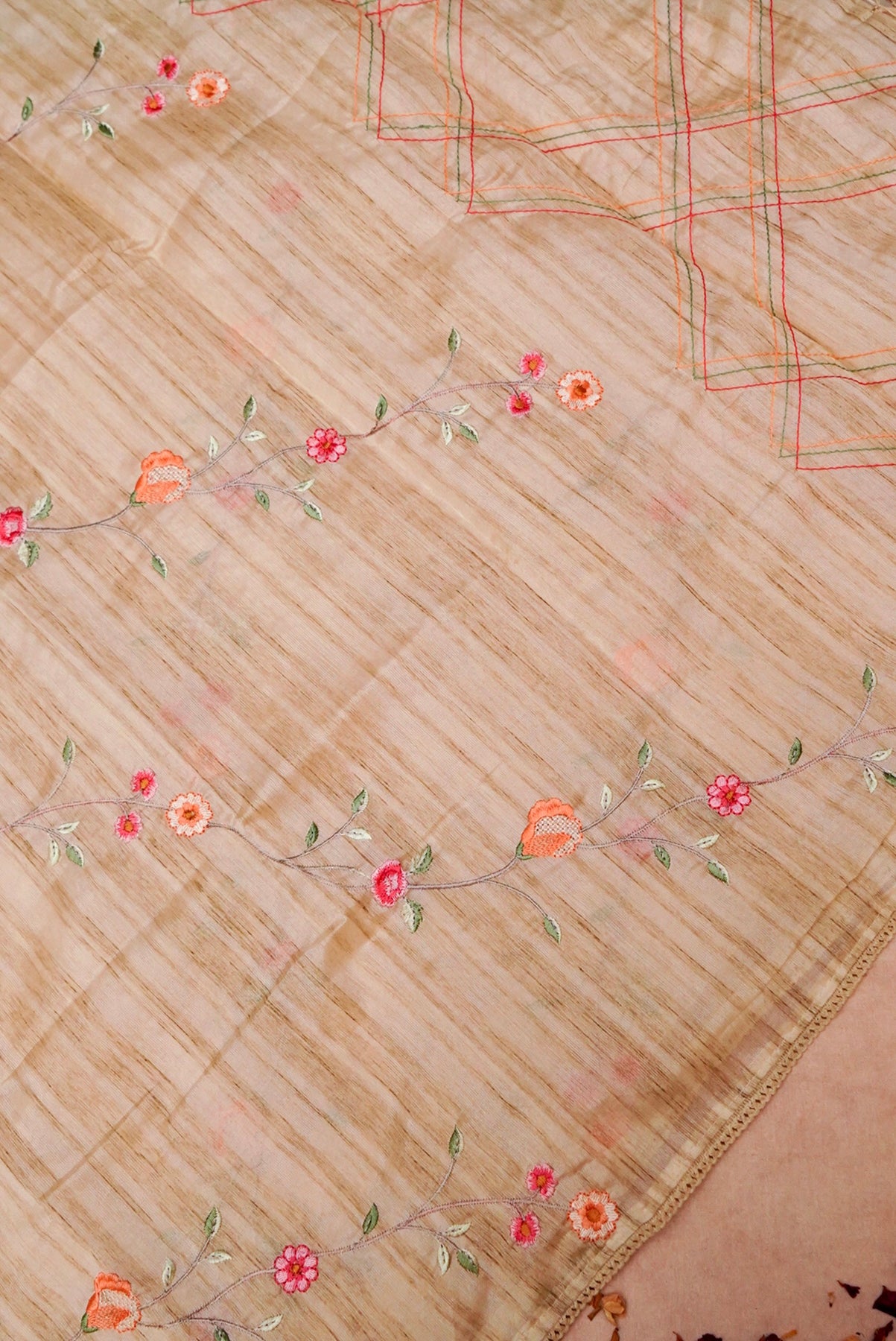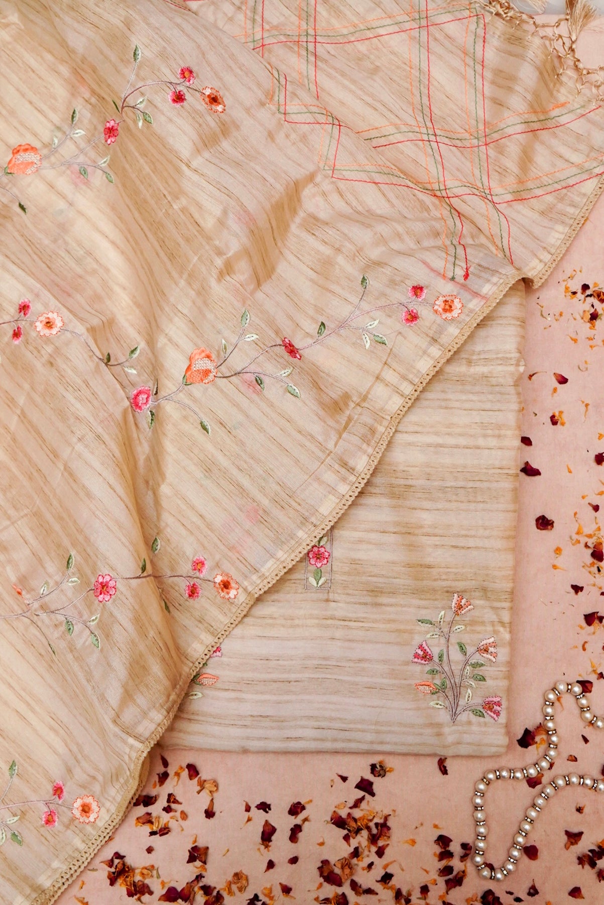 Beige Gold Chanderi Tussar Silk Suit with Thread Embroidery and Parsi Work