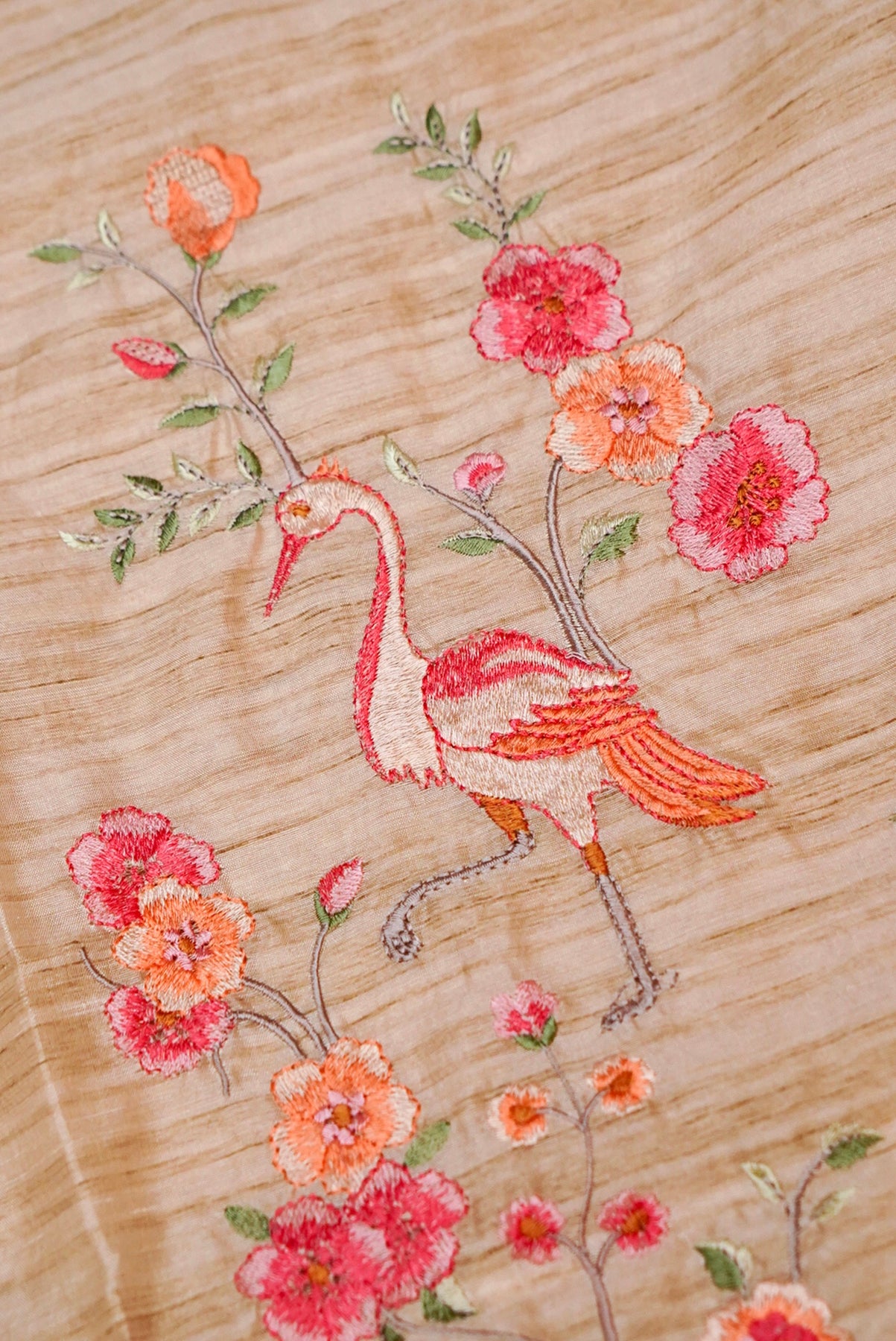 Grace your wardrobe with this Beige Gold Chanderi Tussar Silk Suit, exquisitely crafted with fine thread embroidery and intricate Parsi work. The subtle sheen of Chanderi Tussar lends it a regal allure, while the delicate craftsmanship adds timeless charm. Lightweight, elegant, and versatile, this ensemble is ideal for festive occasions, cultural gatherings, or formal celebrations. A perfect blend of traditional artistry and contemporary sophistication, it captures the essence of refined luxury and understated grace