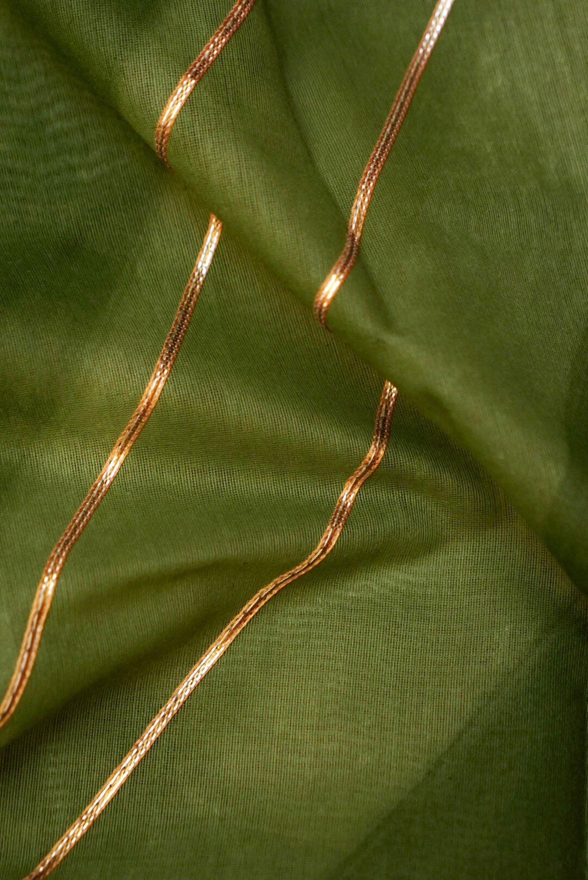 Step into timeless elegance with this Gross Green Pure Chanderi Silk Suit, featuring a Zardozi hand-embroidered neckline that showcases exquisite craftsmanship. The soft sheen of Chanderi silk enhances its royal appeal, while the Leheriya dupatta adorned with delicate gotta lace work adds a festive charm. Perfect for celebrations, weddings, or traditional occasions, this ensemble embodies heritage artistry and modern sophistication, making it a refined choice for those who appreciate handcrafted luxury