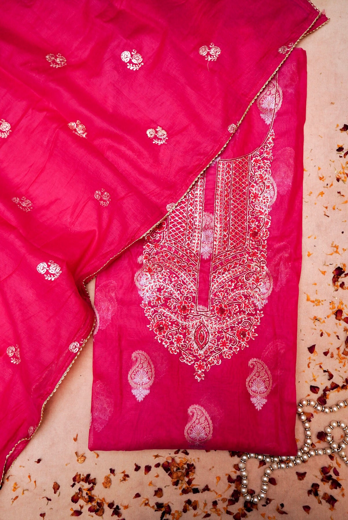 Pink Bridal Handloom Raw Silk Suit with Pitta Zari Embroidery