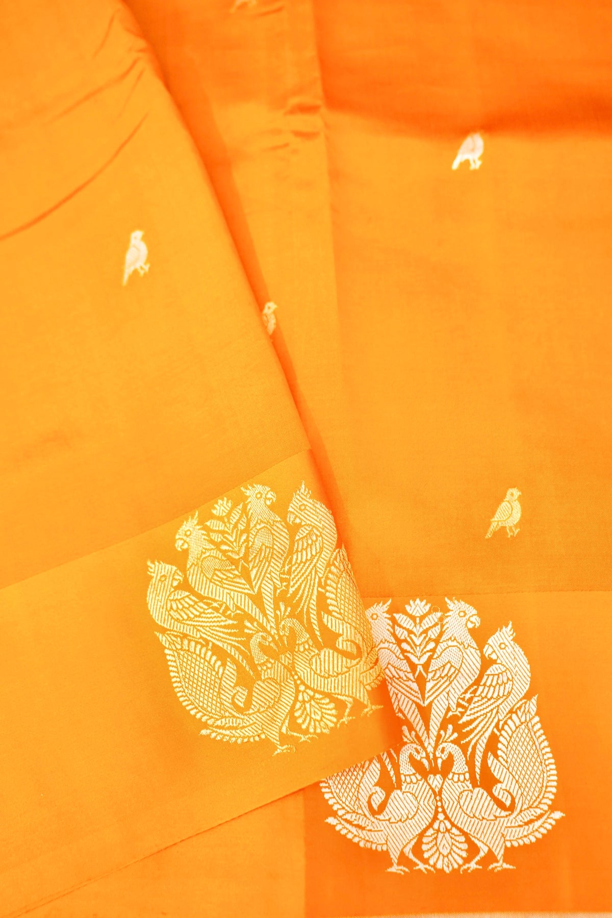 This handwoven Banarasi Pure Katan Silk Saree in vibrant haldi yellow features beautiful all-over zari bird motifs that add a touch of tradition and charm. Soft, lustrous, and finely crafted, it creates a radiant festive look perfect for Haldi ceremonies. Lightweight yet rich in detail, this saree brings brightness, elegance, and timeless Banarasi artistry to your special celebration