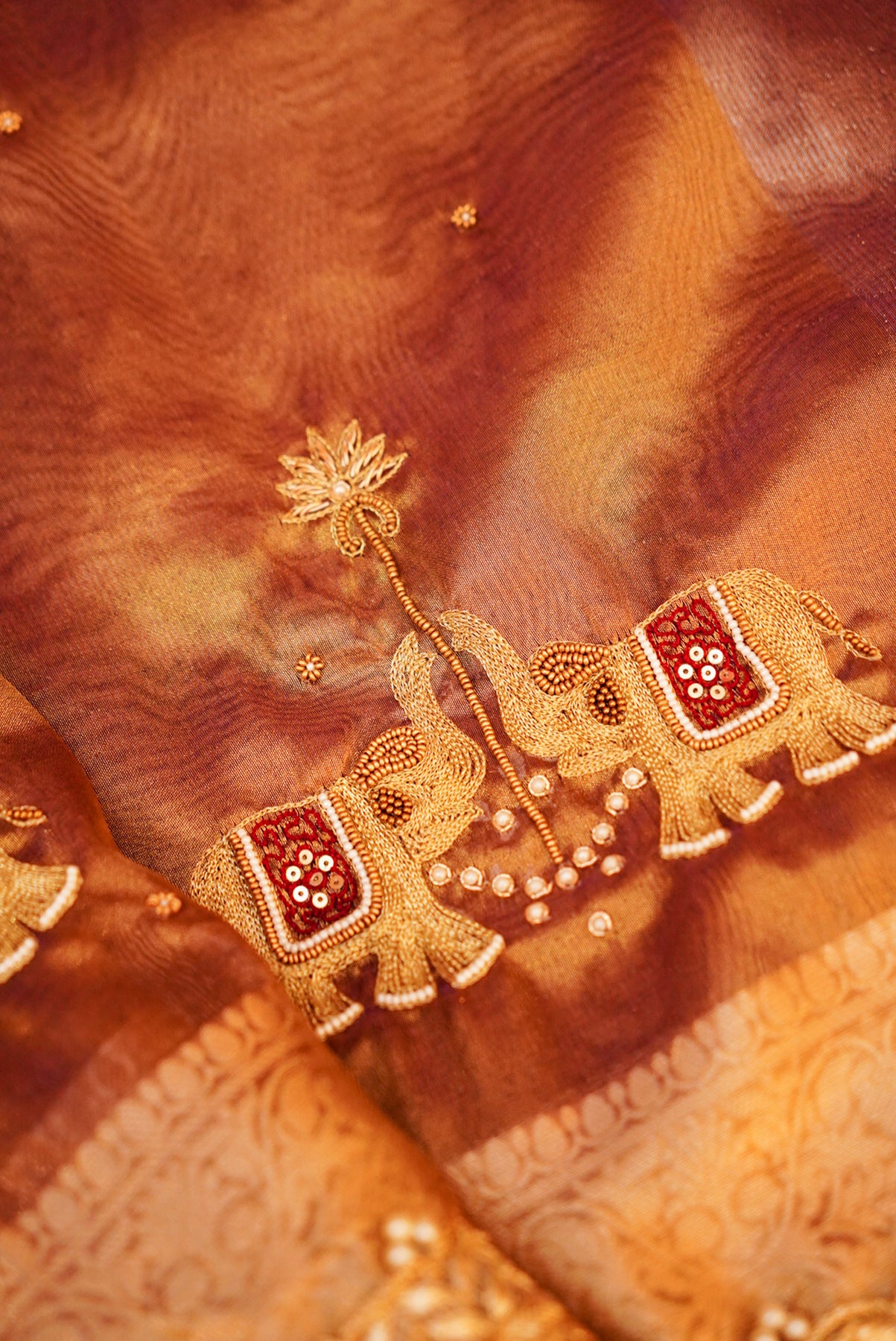 Copper Gold Gajanan Maharani Tissue Saree with Hand Embroidery and Pearl Border