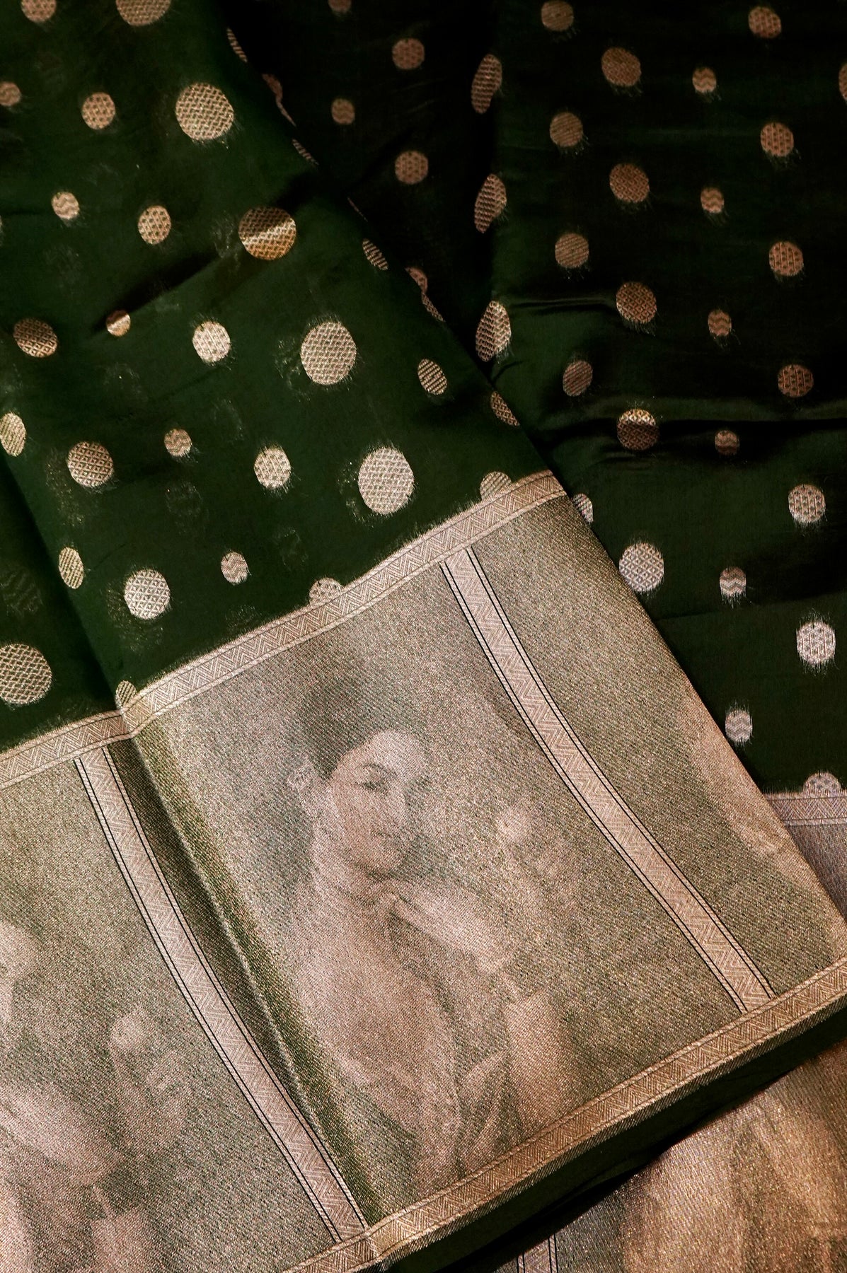 Emerald Majesty – Dark Green Pure Katan Silk Handloom Contemporary Banarasi Madhubala Weaving Saree