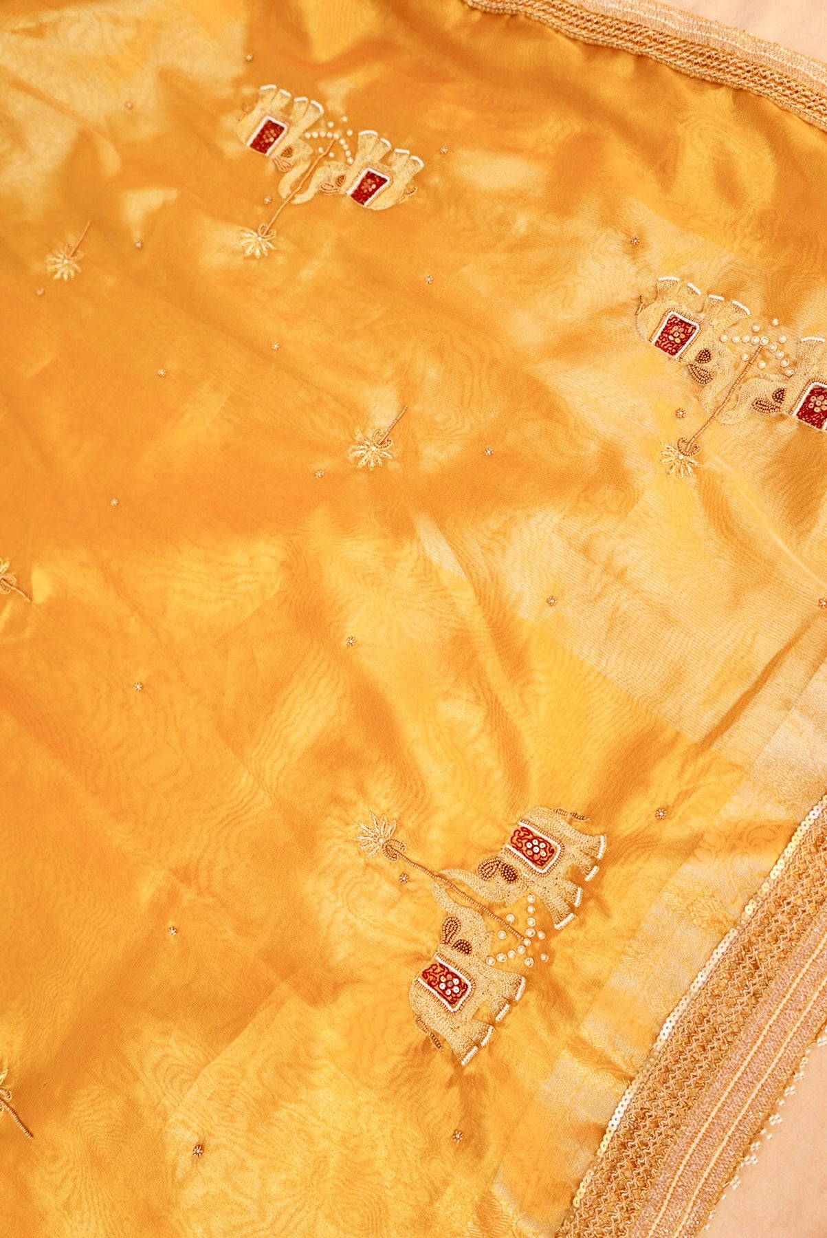 Golden Gajanan Maharani Tissue Saree with Hand Embroidery and Pearl Border