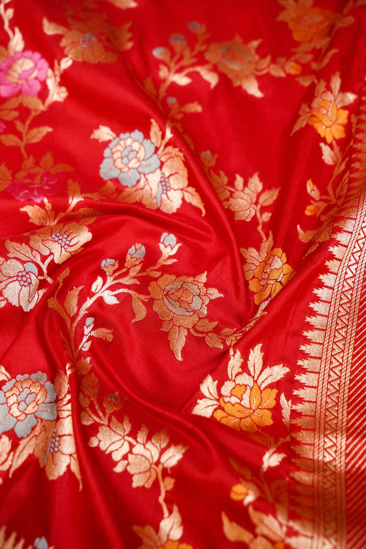 Bring home timeless Banarasi luxury with this Handloom Pure Katan Silk Meenakari Jangla Saree, crafted by skilled artisans with rich traditional detailing. The saree features an all-over zari and thread weave Meenakari Jangla design, creating a grand and royal look. Enhanced with a beautifully woven heavy border and richly designed pallu, this masterpiece reflects premium handloom craftsmanship. Perfect for weddings, bridal wear, and festive occasions, it offers a smooth silk drape, elegant shine, and authentic Banarasi heritage charm