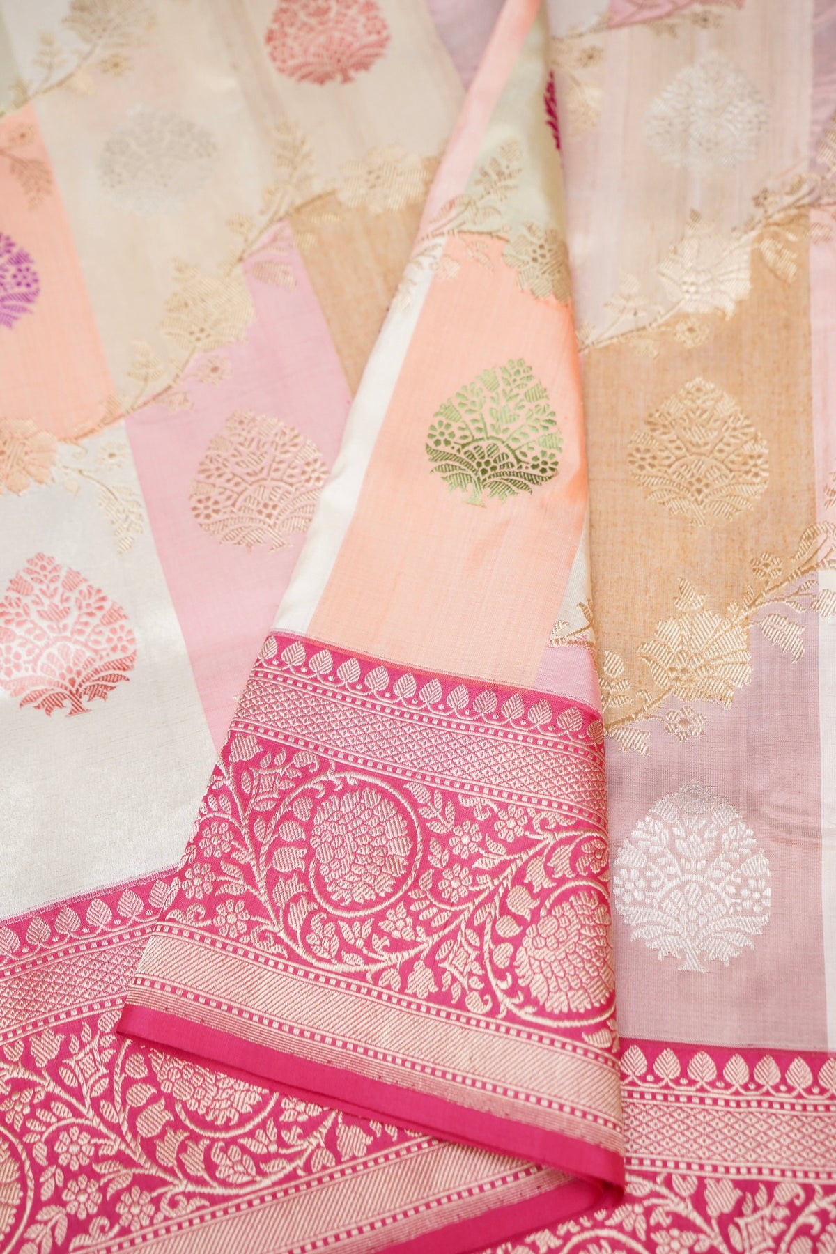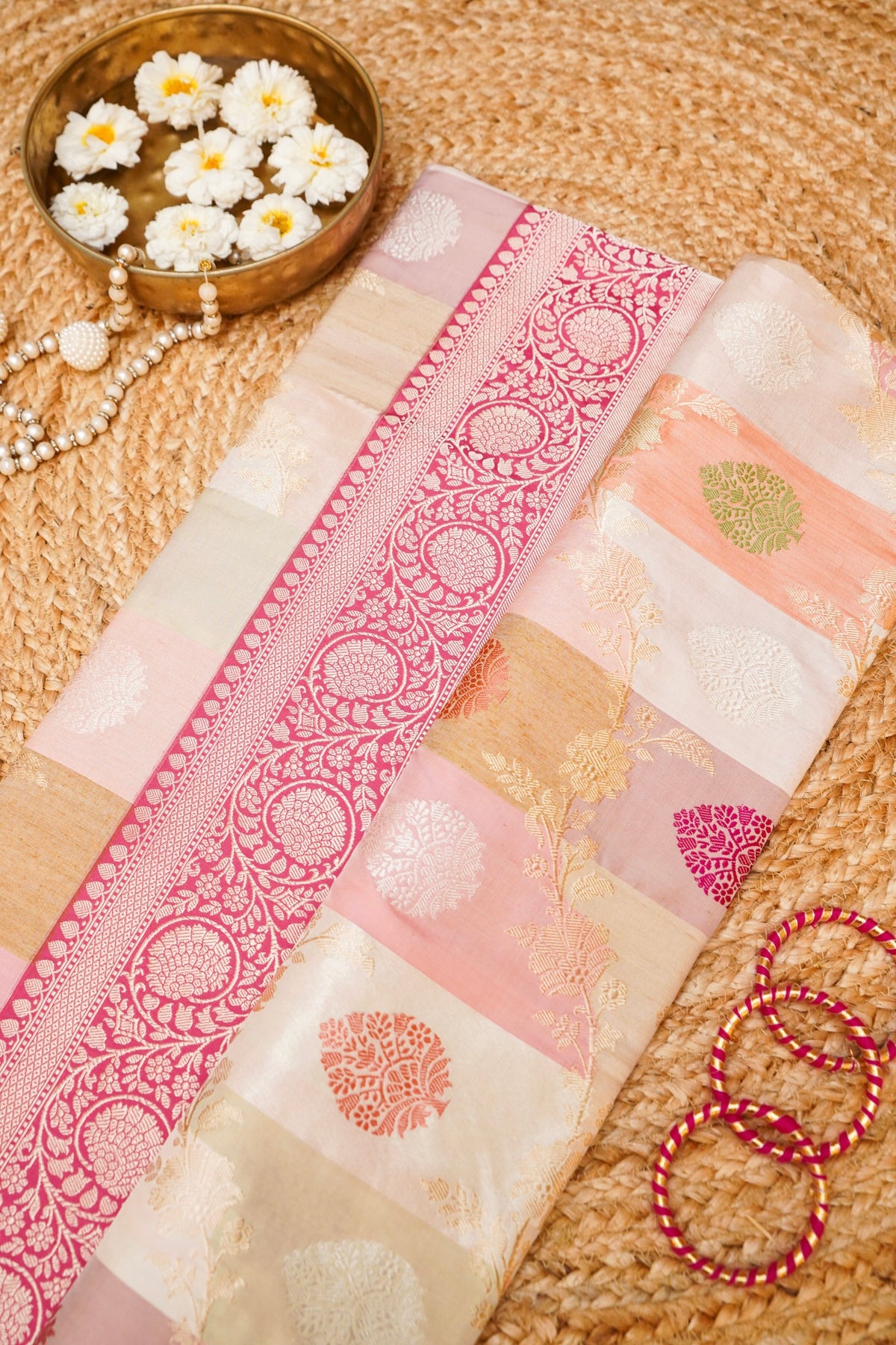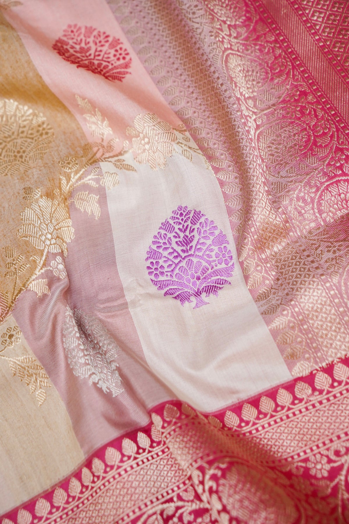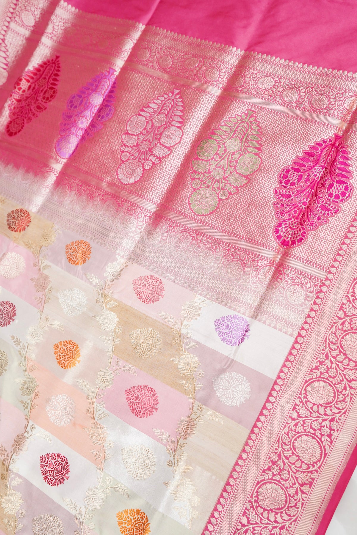 Experience true Banarasi grandeur with this Handloom Pure Katan Kadwa Rangkaat Saree, crafted as a masterpiece of tradition and luxury. Woven with exceptional skill, this saree features an exquisite Rangkaat technique using over 22 different colours, creating a vibrant and royal appeal. Uniquely made with 4 different fabrics combined into one saree, it reflects unmatched craftsmanship and richness. Perfect for weddings, bridal wear, and grand occasions, this saree offers a luxurious drape, timeless beauty, and pure handloom elegance