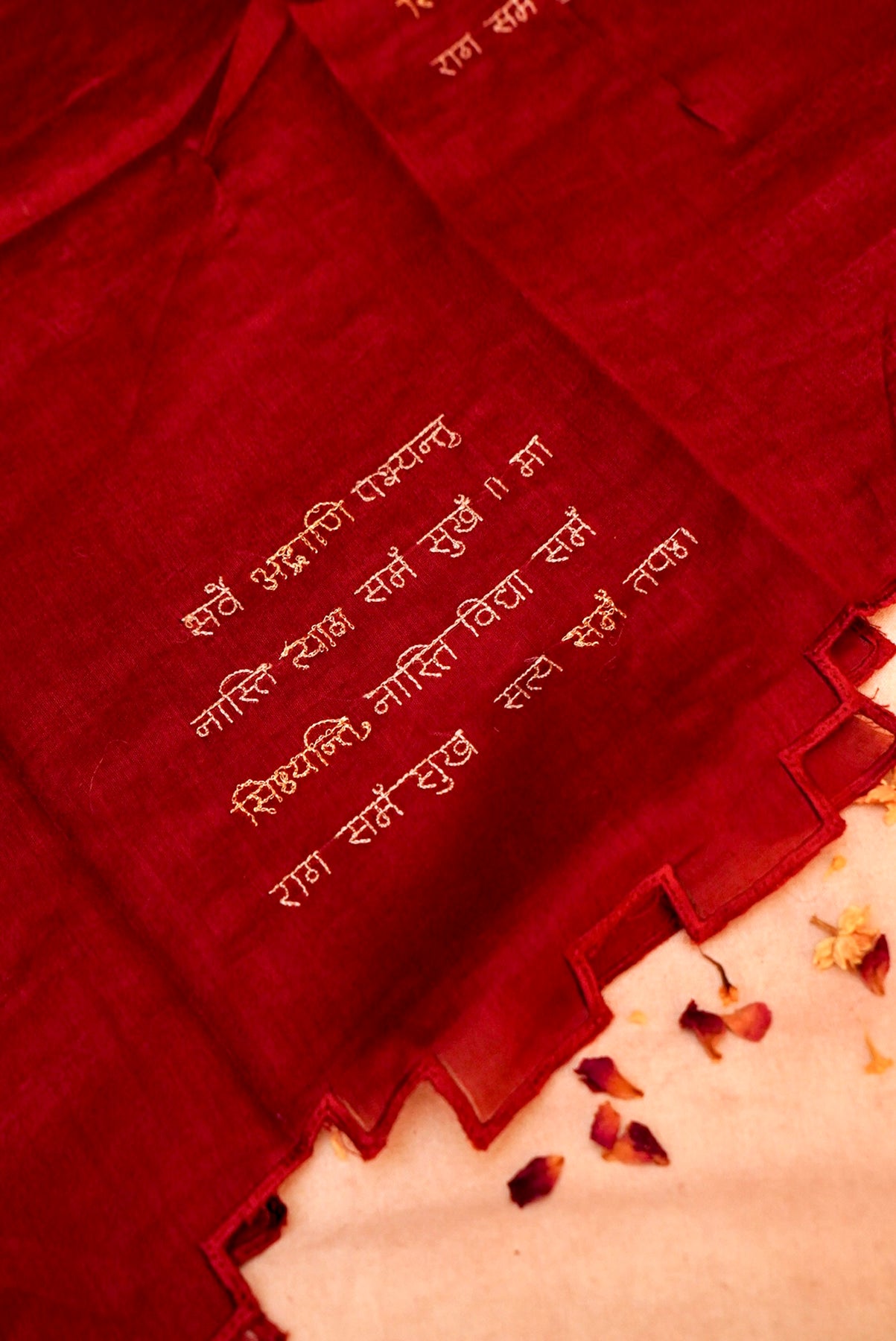 Celebrate tradition with our Maroon “Shanti Mantra” Pure Chanderi Silk Suit, featuring subtle motifs inspired by sacred Shanti Mantras for a spiritual and elegant touch. The luxurious Chanderi silk fabric offers a soft sheen and graceful drape, while the scalloped dupatta adds a contemporary twist to classic charm. Perfect for festive gatherings, cultural ceremonies, and special occasions, this handcrafted ensemble beautifully blends heritage artistry with modern sophistication, creating a timeless ethnic statement