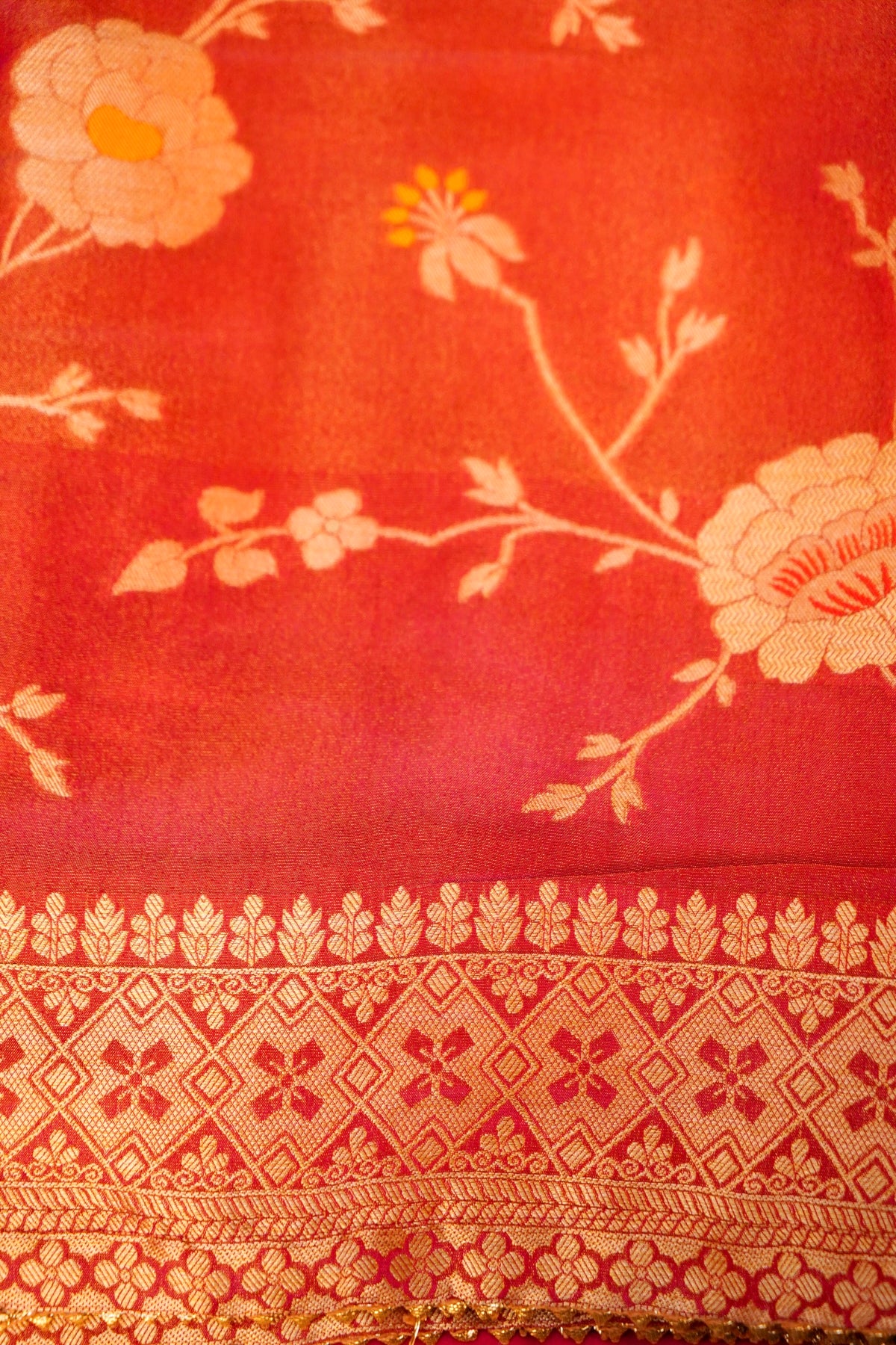 Radiate grace and celebration in our Pink Tissue Silk Saree, a splendid fusion of softness and grandeur. The saree is adorned with an exquisite Meenakari Jangla weave, showcasing intricate floral artistry and luminous detailing. Paired with a dupatta featuring royal elephant motifs, it captures the essence of Banarasi craftsmanship — perfect for weddings, festive gatherings, and elegant traditional occasions