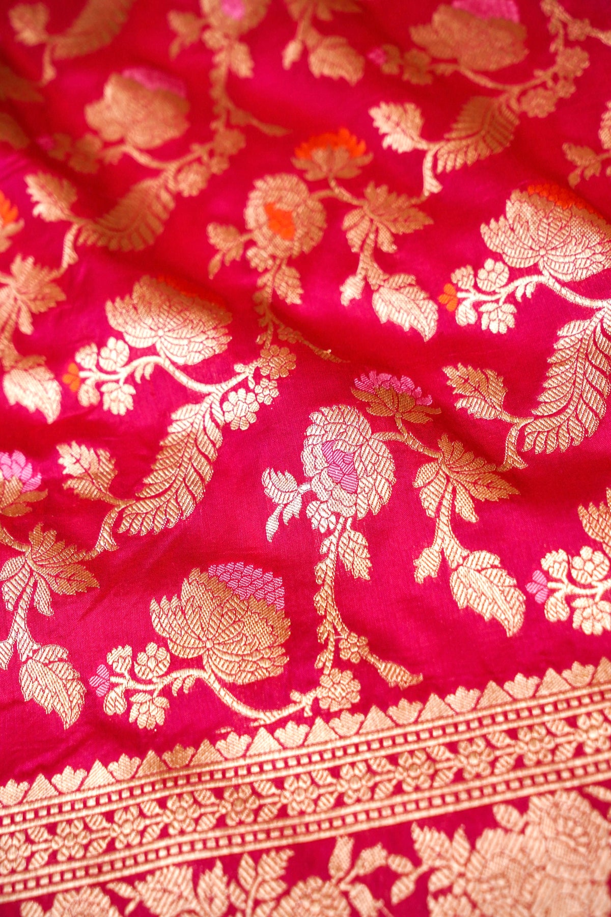 Step into royal elegance with this Pink Handloom Pure Katan Silk Meenakari Jangla Saree, beautifully crafted by Banarasi artisans. The saree features an all-over zari and thread woven Meenakari Jangla design, giving it a rich and luxurious appeal. Its stunning heavy border and grand pallu enhance the traditional charm, making it perfect for bridal wear, weddings, and festive occasions. The soft Katan silk texture and graceful shine create a timeless statement of heritage and beauty