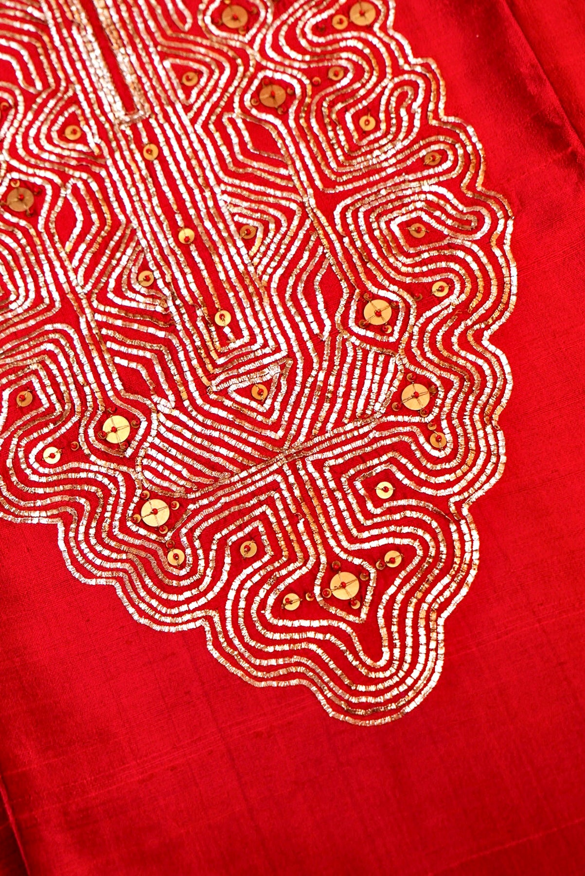 Make a striking statement on your special day with this Red Bridal Handloom Raw Silk Suit, featuring a Pitta Zari embroidered neckline that exudes regal charm. The rich texture of handloom raw silk adds depth and elegance, while the pure organza Kadwa dupatta enhances its festive grandeur. Perfect for weddings and ceremonial occasions, this ensemble beautifully combines traditional craftsmanship and luxurious fabrics, offering a timeless bridal look that reflects sophistication, grace, and handcrafted artistry