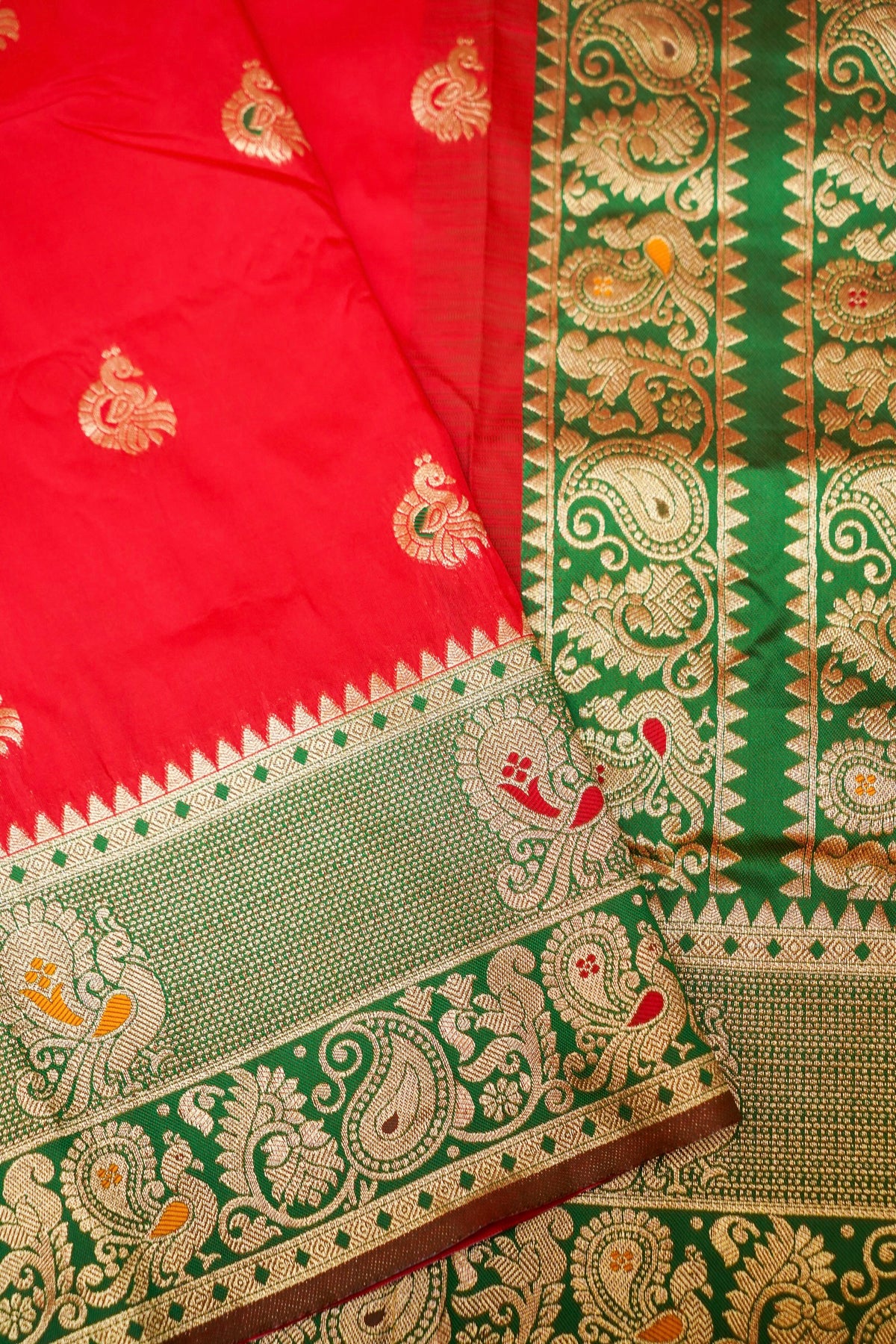 Red Soft Silk Kanjivaram Inspired Bridal Bird Motifs Saree with Contrast Border Pallu