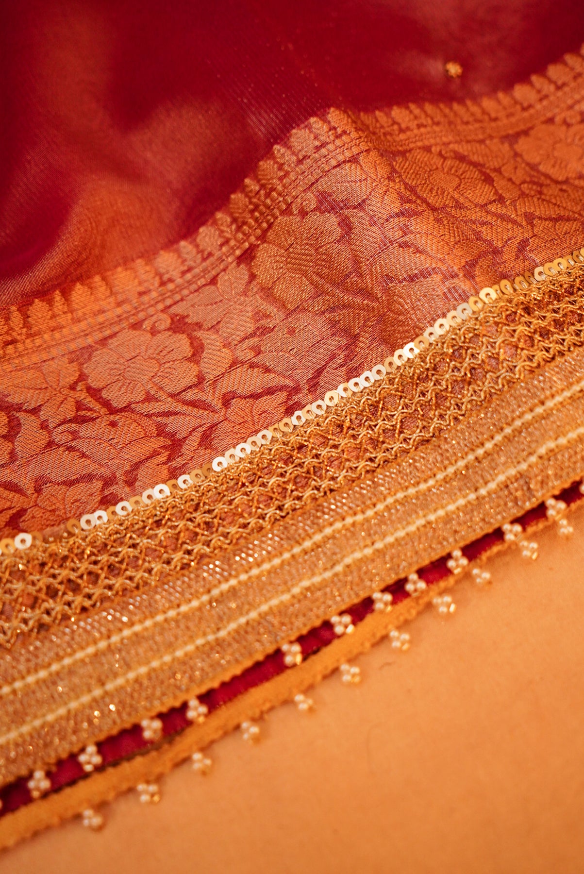 Rose Gold Gajanan Maharani Tissue Saree with Embroidery and Pearl Work