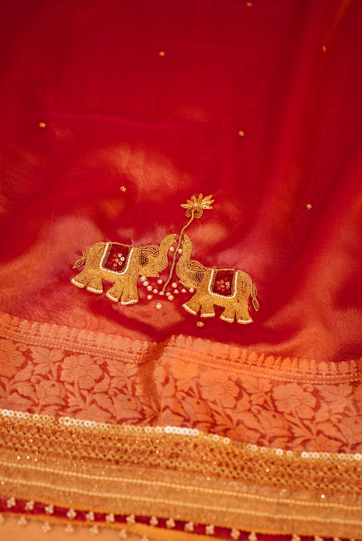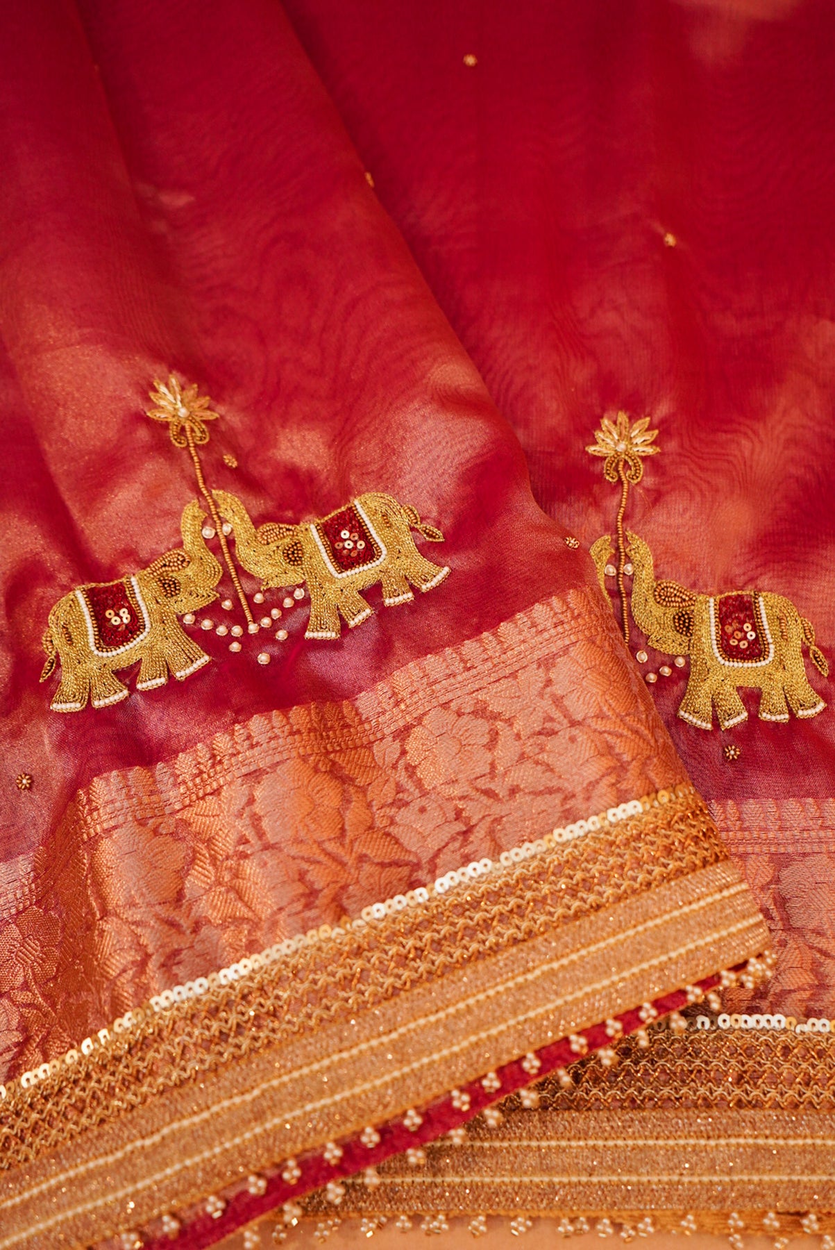 Radiate royal elegance in this Rose Gold Gajanan Maharani Tissue Saree, exquisitely hand-embroidered to reflect timeless artistry. The delicate shimmer of the tissue fabric beautifully complements the intricate detailing, while the pearl-encrusted border adds a touch of regal charm. Lightweight yet luxurious, this saree drapes gracefully—perfect for weddings, festive occasions, and grand celebrations. A true masterpiece that blends traditional craftsmanship with sophisticated elegance, making it a must-have for your ethnic collection